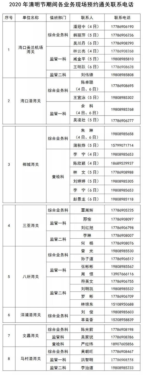 商报全媒体讯(椰网/海拔手机端记者 陈文圣 报道)根据《国务院办公厅关于2020年部分节假日安排的通知》,海口海关2020年清明节放假时间为: 4月4日(星期六)至4月6日(星期一),共3天。为确保节日期间进出口货物正常办理海关手续,现将我关清明节期间有关工作安排通知如下: 海口美兰机场海关、三亚海关节日期间正常办理旅检通关业务;海口港海关邮检科节日期间正常办理行邮物品监管业务。 海口美兰机场海关、海口港海关、椰城海关、三亚海关、八所海关、洋浦港海关、文昌海关、马村港海关等部门单位按预约报关制要求受理相关业务。