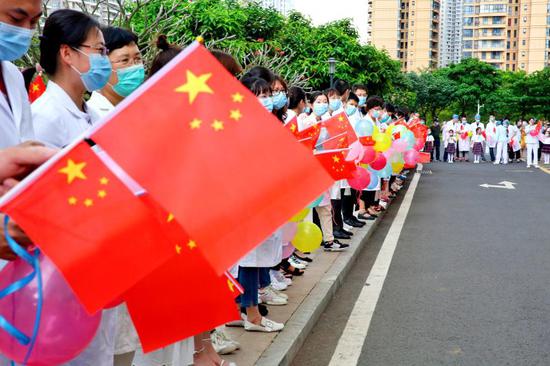 白衣执甲,英雄凯旋。4月3日,海南省肿瘤医院返琼援鄂医疗队队员结束了14天隔离休整期,从三亚返回海口。当天下午,医院举办了热烈的欢迎仪式,全院职工以最高礼遇,迎接英雄回家。 气球飘扬,红旗招展,久候在医院大门口的院领导及医护代表、家属翘首以盼,英雄们的巨幅照片被高高举起,写有“热烈欢迎援鄂白衣战士回家”的横幅格外醒目而暖心。当车门开启,所有人都心潮澎湃,礼仪人员向凯旋的英雄献上鲜花,6名可爱的小朋友动情演绎着手语舞《听我说谢谢你》。“你们辛苦了!”“欢迎回家!”现场的掌声和欢呼声久久不息,英雄们与家人、同事、朋友紧紧相拥,所有积攒的辛苦、思念,终于在这一瞬间化作热泪和拥抱。 ![]() 当再次踏入久违的门诊大厅时,医院泌尿外科护士长林欣不禁热泪盈眶。50天前,她出征时接下院长递交的旗帜,曾许诺过:“我们一定安全归来,一个都不会少!” 今天,他们做到了! “向院领导、集团及全院同志们报告,我们平安归队啦!”林欣破涕为笑,“近两个月的时间里,我深刻体会到了敬佑生命的意义,和自己执着于医务事业的责任和使命。下车的那一刻,我觉得活着真好,回家真好,愿祖国国泰民安、山河无恙!” ![]() 90后ICU护士李艳与阔别了近两个月的父亲紧紧相拥,她说,“援鄂工作不仅让我成长,还让我收获了满满的战友情,这将是我人生中最难忘、最宝贵的人生经历,并鼓舞我不断前进!” 从出征驰援湖北,到今日平安归来,已经过去整整50天。2月14日,该院ICU主任邓春、泌尿外科护士长林欣、神经外科护士王海丽、ICU护士李艳、呼吸内科护士汪通源等医护骨干,随海南省第四批援鄂医疗队,奔赴湖北荆州抗疫前线。在前线奋战的数十个昼夜中,他们以医者的仁医仁术,拯救了一个个被新冠病毒摧残的生命,使79名患者痊愈出院,实现“零感染、零危重、零死亡”的目标,不负900万海南人民的重托,完成抗疫重任。 ![]() 抗疫期间,省肿瘤医院 7名“疫”线医护人员“火线入党”,欢迎仪式现场举行了入党宣誓仪式。驰援湖北和支援海口抗击新冠肺炎疫情的医疗队员被授为“最美白衣战士”团队,医院为他们颁发了奖牌和纪念奖杯,表彰他们敢于担当、勇挑重任、甘于奉献的崇高精神。 ![]() 春风沐椰城,英雄凯旋归。新时代最可爱的人,欢迎回家!(通讯员庄晓珊 陈琳) |