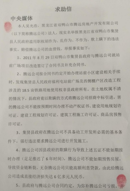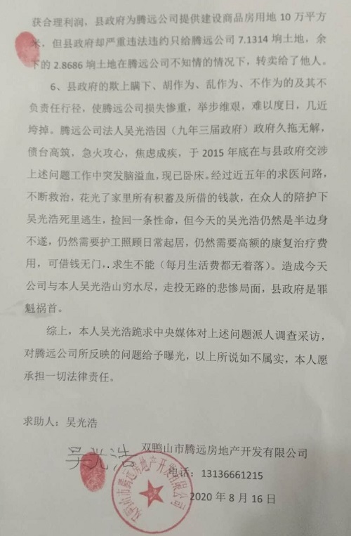 黑龙江省双鸭山市腾远房产公司法人吴光浩的求助信