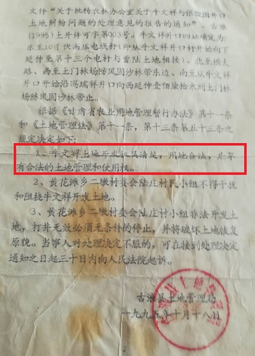 甘肃古浪:政府下发的文件为什么得不到落实 本人牛文祥,系甘肃省古浪县黄花滩村民。1988年冬,我响应党和政府的号召,带领本村农民走出山区,四处贷款筹措资金,在古浪县土门镇二墩村陆庄组永久性协议转让了一块四址界限明确的荒滩地,并上报政府有关部门同意。 随后,古浪县国土局为我颁发了土地开发许可证,各种手续齐备后我就开始着手土地平整、打机井,到1989年部分土地开发已初具规模。与此同时,我先后引领从山区下来的100多户移民来此处居住,我在引领移民过程中承诺给对方平整好土地后,由我出资打井取水,由移民支付一定的开发成本费后久性入住。 不料西靖乡村民陆润(系牛文祥的井地入户人员)竟然利用关系(麻国祥,当时系两西指挥部领导和副县长)在古浪县套取“两西”开发资金5万元,并将原本属于我的一部分土地据为已有,导致我引领的一部分移民无地可种。无奈,我只能把主要精力花费在了上访维权,从此我由一个开发移民致富的带头人,被迫变成了“告状专业户。” 1990年12月,古浪县人民政府以古政发[1990]656号文件下发,主旨解决我的上访事宜,并达成了处理方案,之后一直没有得到落实。在该文件中表明,我在沙梁东打井,陆润在沙梁西打井,期间在我合同内划拨400亩土地,并套取“两西”开发资金5万元,文件要求我们两家联合,但由于矛盾过深无法联合。我想,既然陆润强占了我合同内400亩土地,我也认了,事实是他强占了我几乎近1000亩土地,那么,其余的土地是不是该归还我安排山区农户? 1995年古浪县土地管理局认定的土地开发权属清楚 后来由于我的上访,古浪县土地管理局又下发了土监字[1995]第004号土侵权行为决定书。古浪县人民法院(1997)古土民初字第13号民事判决书,也明确了我的土地权属。武威地区行署于1999年10月还专门下发了督查令,但是至今没有得到落实!从此让我背上了沉重的债务! 事实上,本人土地开发受阻的一个重要原因便是人民法院的判决一直被古浪县行政行为干预,阻止,从而得不到认真执行。行政干预司法的现象是我国民主法治建设的一大障碍,虽然中央一再强调要依法治国,依法行政,但是有些领导就习惯于“我说了算”! 2016年土地确权的时候,我曾向有关部门反映不能土地确权的材料,待矛盾弄清楚之后在确权,不知什么原因。在2017年3月25日黄花滩乡政府派去了确权的人,已进行确权,导致村民乱开发,乱修建,无人阻挡。 无奈之下,本人只好将这一切诉诸于媒体,希望引起上级有关领导的关注,让我多年的诉求能够得以解决,使我的合法权利不受侵害。 《甘肃日报》曾以《牛文祥 十年难圆开发梦》报道 古浪县黄花滩镇新西村十一组 牛文祥 2020年10月28日 |