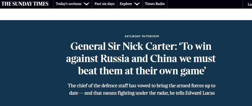 原标题:英国最高级军官提出“在非战争冲突中击败中俄”新战略,俄媒:不还是冷战思维吗? [环球网报道 记者 刘洋 侯佳欣]“想战胜俄罗斯和中国,我们必须在他们自己的游戏中击败他们!”当地时间12月19日,英国《泰晤士报》公布对英国国防参谋长尼克·卡特的专访内容,并把他这句话作为标题点。卡特自己的解释是,“这意味着要在低于战争门槛的(斗争中)击败他们”,也就是说要在尚未达到战争级别但无休无止的冲突中击败俄中。俄罗斯RT电视台20日对此的评论是,这种论调长时间存在于英国高层的头脑中,卡特所谓“与时俱进”的新战略,只是来自于根深蒂固的冷战思维。 下面这位就是尼克·卡特↓ ![]() 卡特是英国最高级别军官。 英国《泰晤士报》的文字和摄影记者走进了他的办公室对他进行了专访。 报道从卡特办公室里一把金色的自动手枪开始写起,篇幅很长,而俄罗斯和中国十分抢眼。 RT则在转述时说,卡特在采访中把莫斯科形容为“严重威胁”,而中国被形容为“长期挑战”。这位英国将军相信,如果英国要应对来自这两个国家的威胁与挑战,英国就需要一份“新战略”,于是卡特说了开头的那段话:“想战胜俄罗斯和中国,我们必须在他们自己的游戏中击败他们,这意味着要在低于战争门槛的(斗争中)击败他们”。 ![]() 《泰晤士报》报道随后介绍了一些卡特关于军事方面的观点并回顾了其此前发言。卡特在17日的演讲感叹称,新冠疫情令国际秩序和国际体系失败,同时也让威权主义不断蔓延等问题更加突出。 RT说,就是在那次演讲中,卡特依然点出了俄罗斯和中国,强调英国应该如何努力去“威慑”这两个强国。 卡特的话不仅被RT看到,也被网友看到了。 因为使用了GAME(游戏)这个词,有网友用谐音梗对卡特进行了吐槽。 比如有人说, “那么……这是不是意味着英国必须在冰球比赛中击败俄罗斯,在乒乓球比赛中击败中国?”↓ ![]() 还有网友模仿起了中国和俄罗斯的口吻这样写道:俄罗斯:“看看这个小个子,他想在大男孩的桌上打一架。”中国:“他们又是谁?”↓ ![]() |