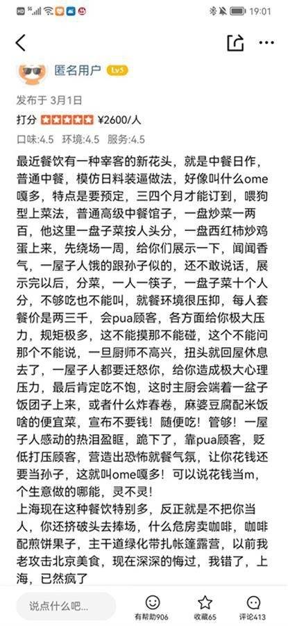 据悉,在一些点评平台有顾客对这家店评论称:“餐厅中餐模仿日料做法,特点是要预订,三四个月才能订到,一盘菜十个人分,份量也不多,每人套餐价是两三千元。” 另据网友展示的该餐厅菜品图片显示,燕窝蛋挞、日式白身鱼的刺身、加拿大象拔蚌等菜品分量较少,还有一个餐盘中,只摆放了切开的两瓣皮蛋。 还有网友称,一道名为贵妃鸡的菜品,厨师做好后会到顾客面前巡场一周,接着拿到后厨切分,偌大的鸡只取大腿部最精华的一片。 上述相关网贴引网友热议,有人质疑该餐厅内容大于形式,向顾客收智商税。 还有网友称类似这种餐馆走的是“中餐日作”的路线,“会PUA顾客,各方面给你极大压力,规矩极多,这不能碰那不能碰,一旦厨师不高兴,扭头回屋休息去了。” |