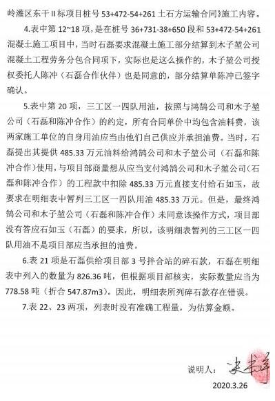 2019年8月24日,商务副经理史书宇通过微信向石磊微信发送了《对账明细表》,该《对账明细表》上没有石如玉签名和水安公司盖章,没有中水六局的项目经理、生产经理崔国印、蔡洪亮、蔺新龙、丁文胜以及中水六局的工程部、财务部、安全部、质检部、设备部、商务部等人员签字,也没加盖中水六局的项目章。 2020年3月26日,史书宇出具《关于<截止至 2019.7.31日石如玉(海南水安建筑工程有限公司)对账明细表>的说明》,阐明当时是石磊为了向项目部请款,为反映其实施工作的大致金额,统计了此表,表中已付金额财务数据是石磊提供的,因为不是最终的对账结算单,该明细表既不是结算单也不是财务部门出具的对账单,不具有对账、结算的效力。