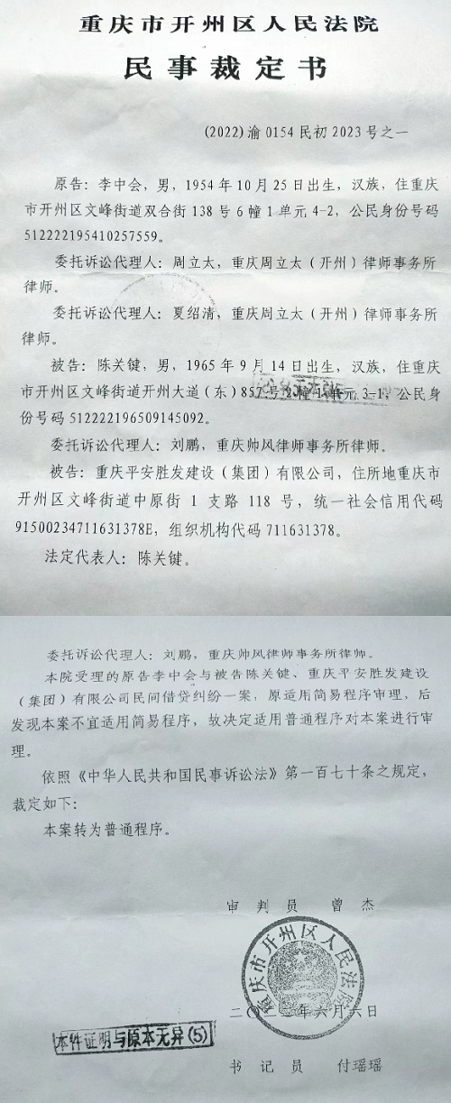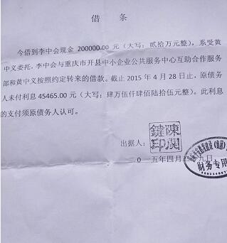 | 原开州区政协副主席陈关键,还我血汗钱 我是开州税务退休职工李中会,曾把自己的20万元血汗钱借给了黄中义经营的小额贷款公司。1999年,陈关键创办的重庆平安胜发建设集团有限公司,在经营期间,陈关键向黄中义借款近亿元。2015年5月,开州黄中义经营的小额贷款公司出现严重还款压力,要求陈关键及时归还黄中义上亿元的贷款资金,以缓解黄中义的还款之难。 陈关键涉案很多,风险极高 然而,陈关键抓住了发财之机,提出凡是亲朋好友,黄中义没还的借款,可凭黄中义出据的借条到陈关键公司抵兑,承诺当年偿还抵兑欠款。这样,黄中义的上千万元的债务转到陈关键公司,陈关键不支付利息。当时陈关键这样做,黄中义是坚决反对的,但没办法陈关键因手中有权,黄中义无可奈何。 然而,陈关键并未兑现自己的承诺,当年没还一分钱,现在7年多了仍没还一分。有时催收还遭呵骂!当时陈关键是帮了亲朋好友大忙,大家都很感谢他,7年之后来看陈关键很有欺骗行为,现在很多人不敢站出来争取自己的权利,因为是亲朋好友。 今年5月期间,一债权人与陈关键沟通交流,陈关键再次承诺,在今年12月归还抵兑的债务,包括李起诉的。陈关键是否言而有信,大家拭目以待。 陈关键及平安胜发公司出具的借条(原件在开州区人民法院) 我是2015年4月由陈关键及平安胜发建设集团公司出具了借条的。多次催要无果。今年2月,我又托人找到陈关键,陈关键说的话真令人气忿不平,逼得我走法律程序。 附:陈关键个人履历(来源百度百科) 1984.07--1988.07 四川省成都化工厂双流分厂工作(其间: 1984.07--1988.07 湖南大学化学系化工专业 带薪学习) 1988.07--1989.12 四川省成都市双流硼砖厂技术员,车间主任 1989.12--1991.02 四川省开县长沙砂砖厂技术员 1991.02--1993.05 广东省裕成鞋厂生产主管 1993.05--1998.06 广东省东莞力霸染厂副厂长 (其间:1995.06 -1998.7中国科技大学金融专业函授本科毕业) 1998.06--2007.01 重庆平安胜发建设(集团)有限公司董事长 (其间:2003.10 中央党校干部管理学院学习; 2003.12 被重庆市人事局评为高级工程师) 2007.01--2007.02 重庆市开县工商业联合会主席,重庆平安胜发建设(集团)有限公司董事长 2007.02--2007.12 重庆市开县政协副主席(兼)、党组成员,县工商业联合会主席,重庆平安胜发建设(集团)有限公司董事长 2011.03开始重庆市开县政协副主席(兼)、党组成员,县工商业联合会主席、党组副书记,县总商会会长,九龙山镇党委书记 |