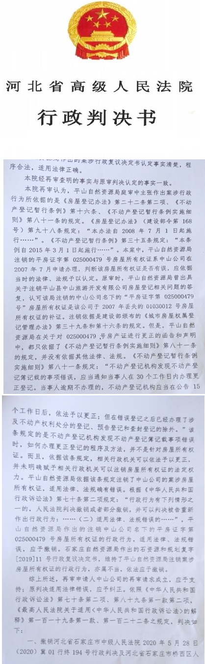 | 河北平山县一单位否定省高院判决! 法学专家:依法行政的反面案件 文 □ 李海波 县政府成立局级单位发展旅游 改制后建成全国重点风景名胜区 平山县上三汲乡寺沟村村东万寿寺 河北平山县三汲乡东林山西麓有个万寿寺,万寿寺塔林占地约66670平方米,原有万寿寺高僧墓塔23座,现存2群13座。其中2号墓塔为唐天寿太子(法号圆泽)墓塔,故又称唐太子墓塔群。除1、2号塔为唐、五代所建外,其余为宋、元、明、清建筑。 文革时万寿寺被毁坏。平山县政府1992年9号常务会议纪要显示,成立中山国旅游开发总公司,归县政府直接领导,局级机构,事业单位;三汲中山国文物保管所化归由中山国旅游开发总公司;财政借给公司5千元作为开办费,建设经费可采用古人修建庙宇的方法,利用林山庙会和其他途径捐资,同时要通过大力宣传中山国的开发前景,争取国内资金和国外资金。县里还成立了旅游开发领导小组,并说明工程免除全部税费。 石政计投(1993)89文件对平山县林山中山国旅游开发项目立项批复:同意开发林山景区,水上建设、景点建设、道路建设;林山景区五项建设工程。之后林山中山国旅游开发总公司取得国有资产产权登记证。 1993年7月公司取得住所和经营场所使用证明。 1996年中共平山县委44号文件关于林山中山国旅游开发现场办公会纪要明确指出:旅游开发要坚持谁投资谁受益,先建设后收费;林山万寿寺属国家所有。 ![]() 2000年平山县人民政府下发《关于加强东灵山风景区管理的通知》,对景区控制范围进行了确认。 2002年5月平山县中山旅游开发公司开发的西柏坡-天桂山风景名胜区被列入国务院第四批国家重点风景名胜区。 2006万寿寺塔林作为五代至清的古建筑,被国务院列入第六批全国重点文物保护单位。 2010年,所在村出具的土地所属证明 假万寿寺出现 公司遭多方打压 法律维护却再遇刁难 旅游公司在稳步发展,令法人樊国海想不到的是平山县出现了一个假的万寿寺,他也不以为意:自己是旅游开发项目,不以寺庙为生意。但后来事情的发展给他带来意想不到的灾难。 2017年6月26日,樊国海到中国建设银行股份有限公司平山支行办理万寿寺对公帐户开户事宜时,被银行工作人员告知,已经有人在该行办理过了上三汲乡寺沟村村东万寿寺对公账户,已注册的“万寿寺”帐户资料显示为:“户名:万寿寺;地址:平山县上三汲乡寺沟村村东;住持:释果恒。”银行工作人员说,注册寺庙对公帐户要求非常严格,需要提供“宗教活动场所登记证书、主持本人身份证(或戒牒)”等有关材料。自己的对公帐户怎么被抢注了?! 樊国海从知情人了解到位于平山县北冶乡塔崖村的另一个“万寿寺”是“临时建筑”,大批信众在此捐款、布施(有视频录音为证),录音里显示女弟子介绍国恒师傅投资了2、3个亿,而捐款500元就不让进门,多捐点就可以打电话让他们开门。对于三汲乡那个万寿寺女弟子说没有师傅,宗教局不允许捐款,再说了,领导想法把那边也弄到师傅名底下了。且直言:不是师傅的能力大,而是领导们权大! 2019年1月28日,中山旅游公司收到了平山县不动产登记中心于2018年12月7日作出的《关于对025000479号房权证进行更正的函告》,告知中山公司在2007年7月申请办理位于东林山脚下的房屋所有权证时,没有土地权属来源证明,不动产登记簿记载的事项错误,通知中山公司自收到函告后在30个工作日到登记中心办理更正登记。3月20日,平山县不动产登记中心在石家庄日报刊登声明:“因登记簿记载事项错误,根据《不动产登记暂行条例实施细则》第八十一条的规定,注销中山公司名下的平房证字第025000479号房屋所有权证。”5月8日,中山公司向石家庄自然资源和规划局申请行政复议,7月8日,石家庄自然资源和规划局作出《行政复议决定书》,维持注销房屋所有权证的行政行为。于是中山公司向平山县法院起诉,法院判决驳回原告平山县中山旅游开发公司的诉讼请求。中山公司上诉至石家庄中级人民法院,二审法院判决:驳回上诉,维持原判。不服判决的中山旅游公司向河北省高级人民法院申请了再审。 中山旅游公司在2019年4月30日突然接到寺庙主管部门的《限期撤出通知书》,通知书以涉嫌商业化(从1994年开始我们一直在进行景区的投资原址修建工作,并未对外开放,哪里来的商业化?)为由,要求公司在2019年5月5日前将人员、物品撤出万寿寺景点。樊国海多次找到寺庙主管部门主要领导进行沟通协调无果。 2019年5月16日,上三汲乡政府作出违法建筑拆除通知书,以中山旅游公司在万寿禅寺围墙西侧和南侧的建筑没有取得项目建设用地许可证等手续为由,要求拆除建筑。公司进行了行政复议,平山县政府行政复议维持了乡政府的决定。公司起诉后,平山县法院判决撤销了乡政府的通知和县政府的行政复议决定书。 ![]() 拆除现场(视频截图) ![]() 而房权证问题2021年7月8日有了结果,河北省高级人民法院下达了(2021)冀行再20号行政判决书,高院再审认为平山县自然资源局庭审中主张作出案涉行政行为依据的事《房屋登记办法》第二十二条第二项、《不动产登记暂行条例》第十六条、《不动产登记暂行条例实施细则》第八十一条的规定。而《房屋登记办法》是自2008年7月1日起施行,《不动产登记暂行条例》自2015年3月1日起施行。本案中,平山自然资源局注销的平房证字第025000479号房屋