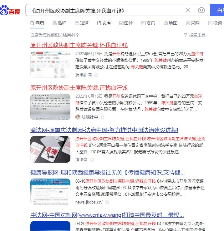 重庆市开州区人民法院雷法官多次要求删帖为哪般? 6月15日,本网发布了《原开州区政协副主席陈关键,还我血汗钱》,在搜狐的该文不知何故被删除,也没有任何官方提示。之后投诉者多次联系本网说陈关键要还钱要求删除该贴。小编答复要提供文章内容不实的公函才能删除。 之后投诉者多次联系小编,说是法院雷法官要求删除文章,她协调陈关键还钱。小编还是要求开州区法院发函才能删除。 8月30日上午,投诉者再次电话小编,说在开州区法院,雷法官要通话。和雷法官通话中,她很生气:你为什么能发帖不能删帖?你有新闻资质吗?!以下为通话录音,小编不作任何评论。