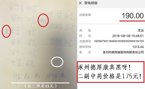 涿州德厚康药店,宰客有点狠 8月8日,家住涿州市水岸花城的一居民去小区外的德厚康药店抓了二副中药,德厚康收了175元。 药店还有医生挂号收费看病,有执业医生证么?是否非法行医,请该市主管部门核查 拿回家后该居民电话开药单的亲戚(都是开药店的),说二副只有50多元。这药价不对呀,相差太远了,是不是算错了?8月10日下午,该居民再次去把药单给德厚康的收银员,让她算了再抓2付。她算了很久,才说172元多。问她哪些药贵,她看了说枣仁30多,龙骨40多,然后是柴胡。问牡蛎说便宜,120克才三元多。 8月11日,该居民去马路对面的的民悦大药房算了一下中药价格,每付才50元,只是淮枣仁是酸枣仁,南沙参是北沙参。 8月12日,该居民去鼓楼一药店,她那一付才42,一下抓了五付,才213元。同样的药单,基本上是五副中药和德厚康的二副中药的价格差不多,这德厚康太坑爹了! 广告遍布水岸花城小区内,是否经过审核?涿州市工商局可以出来走走 网上查询有文章《涿州这30家药店被点名:祥百顺大药房严重失信,德厚康等29家警示》,难怪,涿州德厚康已经被涿州市食药监局列入警示名单的,这德厚康真是无德不厚啊!(撰稿人 李海波) |