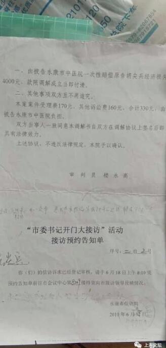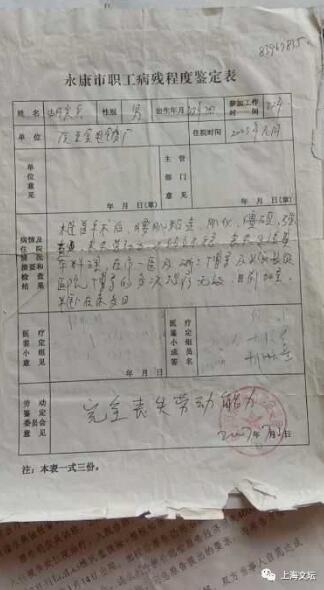 胡尖兵诉说,18年来,他上访了三任七个市长,2006年金华新闻节节棒予以播出。腰椎盘突出开刀致终身残致,使本人精神受到极大刺激,服活血止痛、抗压抑药至今。十几年来,他向中纪委、浙江省小强热线、浙江经视、1818黄金眼、中央二台等多个媒体反映过。当地劳动局委托残联,永康医院检查属于重度残疾,办了重度残疾证。