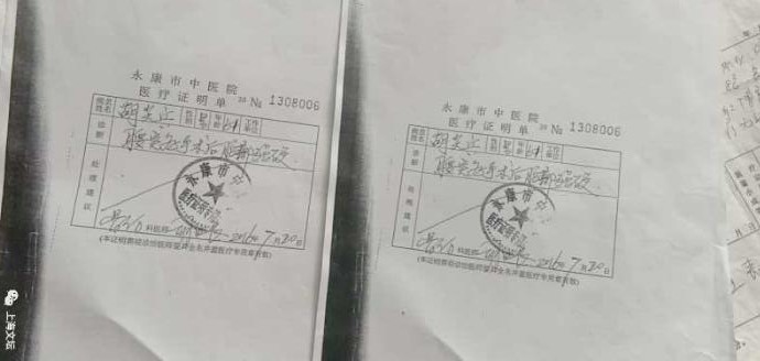 胡尖兵诉说,他属于永康西城紫薇居委会居民。2004年底因患普通腰椎间盘突出,去上海长征医院由博导倪斌、博导贾连顺收治诊治,医生诊断为腰椎5-骶椎1-多处突出,骨质退化增生症,不适合手术,住院8天诊治无效果。之后在杭州省浙二医院、金华地区中心医院、金华中医院住院治疗。永康市人民医院、永康中医院住院二次,多次骨科主任治疗后均无明显效果。