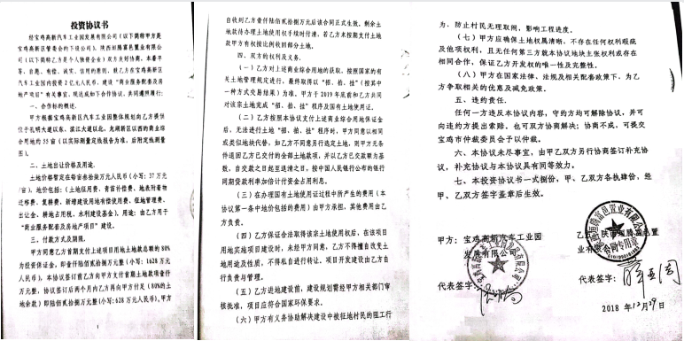 各位领导及各大媒体: 我叫魏新占,是陕西垣腾富邑置业有限公司负责人(以下简称乙方),2018年我公司与宝鸡高新汽车工业园发展有限公司(以下简称甲方)经双方协商达成《投资协议书》,拟对甲方所属位于岐山县蔡家坡镇的土地进行房地产开发投资。 乙方于2018年5月31日,一次性付款壹仟万元到甲方账户作为项目定金,甲方在其所属龙湖新区内划出的55亩建设用地出售给乙方,随即完成了项目示意图,顶线测量报告等工作,并及时将以上结果上报给甲方。双方于2018年12月正式签署了项目《投资协议书》,之后乙方于2019年1月11日又再次付款贰佰万元整给甲方。