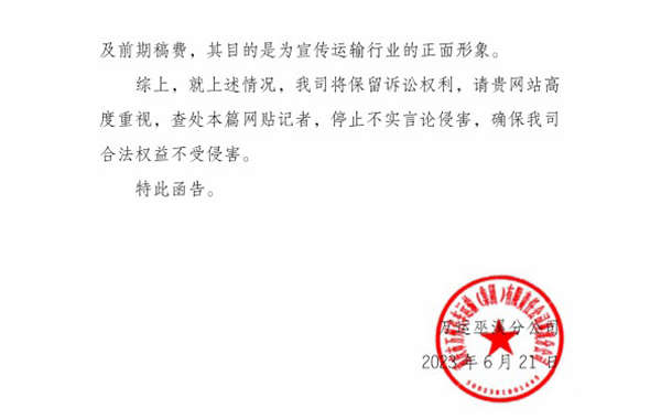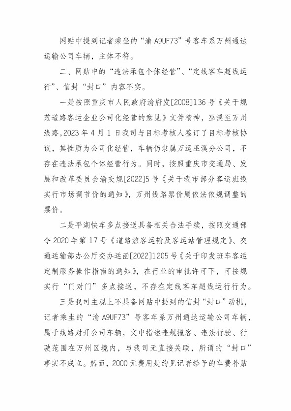 6月14日,本网曾以《重庆巫溪:定线客车超线运行 涉事公司强塞“信封”封口 》曝光了重庆巫溪至万州客运班车超规定线路运行,涉事万运公司巫溪分公司相关负责人强塞装有2000元现金的信封“封口”后,21日,随着巫溪分公司的一封函告,使该事件有了最新进展。巫溪分公司以函告形式称,网贴反映的该公司定线客车超线运行及强塞信封“封口”等不属实。函告坚称其信封“封口”费为预约记者车费补贴和前期稿费,旨在为公司进行正面宣传。 图为:万运公司巫溪分公司在函告 万运公司巫溪分公司在函件中称,网贴中记者乘坐的“渝 A9UF73”号客车非该公司籍车辆,系万州通达运输公司车辆,其曝光主体不符。 针对“违法承包个体经营”,巫溪分公司函告称,该公司按照重庆市人民政府渝府发[2008]136 号《关于规范道路客运企业公司化经营的意见》文件精神,巫溪至万州线路,2023 年 4 月 1 日我司与目标考核人签订了目标考核协议,其性质为公司化经营,车辆仍隶属万运巫溪分公司,不存在违法承包个体经营行为。同时,按照重庆市交通局、发展和改革委员会渝交规[2022]5 号《关于我市部分客运班线实行市场调节价的通知》,万州线路票价属依法依规调整的票价。 对是否、“定线客车超线运行”问题,巫溪分公司函告称,平湖快车多点接送具备相关合法手续,按照交通部令 2020 年第 17 号《道路旅客运输及客运站管理规定》、交通运输部办公厅交办运函[2022]1205 号《关于印发班车客运定制服务操作指南的通知》,在行业的审批许可下,可按规实行“门对门”多点接送,不存在定线客车超线运行行为。 对强塞信封“封口”封口动机问题,巫溪分公司称,“渝 A9UF73”号客车系万州通达运输公司车辆,属于线路对开公司车辆,文中指述违规揽客、违法行驶、行驶范围在万州区境内,与我司无直接关联,所谓的“封口”事实不成立。而“强塞”的2000 元费用,是“约见记者给予的车费补贴及前期稿费,其目的是为宣传运输行业的正面形象。” 巫溪分公司函告最后威胁称,该司“将保留诉讼权利,请高度重视,查处本篇网贴记者,停止不实言论侵害,确保我司合法权益不受侵害。” 25日,曾接到市民情况反映后乘坐 “渝 A9UF73”号客车从万州到巫溪的班线客车媒体人士针对巫溪分公司的《函告》称,贴文反映的是该条线路,并非特指巫溪分公司所属班线客运车辆。其次,这位媒体人士称,该文曝光万州至巫溪客运班线客车问题时,巫溪分公司及该线路所属的客运班车并未取得电子客运资格,仍属点对点客运班线客车,而该车在到达巫溪后被某人要求将乘客送往巫溪县凤凰镇,违法行驶是否在巫溪县境内?。 针对巫溪分公司函告坚称“强塞”的2000元“封口费”系“约见记者给予的车费补贴及前期稿费,其目的是为宣传运输行业的正面形象。”问题,这位媒体人士坚称,此前,巫溪分公司从未与其预约对公司进行正面宣传,且前往任何单位进行宣传时,从未要求和接受过任何“车费补贴”和“前期稿费”。巫溪分公司此说纯粹是为强塞“封口费”进行自我辩解。 图为:巫溪县道路运输客运行业问题整改工作会 该媒体人士持有的一偄录音文件称, 6月14日,巫溪县道路运输事务中心主持召开的《巫溪县道路运输客运行业问题整改工作会》上,参会的巫溪分公司坦承称:其公司客运班车实行承包目标考核责任制,未取得电子客运业务等诸多问题,并在会上承诺将会对相关问题进行整改,举一反三,更好的为乘客服务。 早前文章链接: 重庆巫溪:定线客车超线运行 涉事公司强塞“信封”封口 |