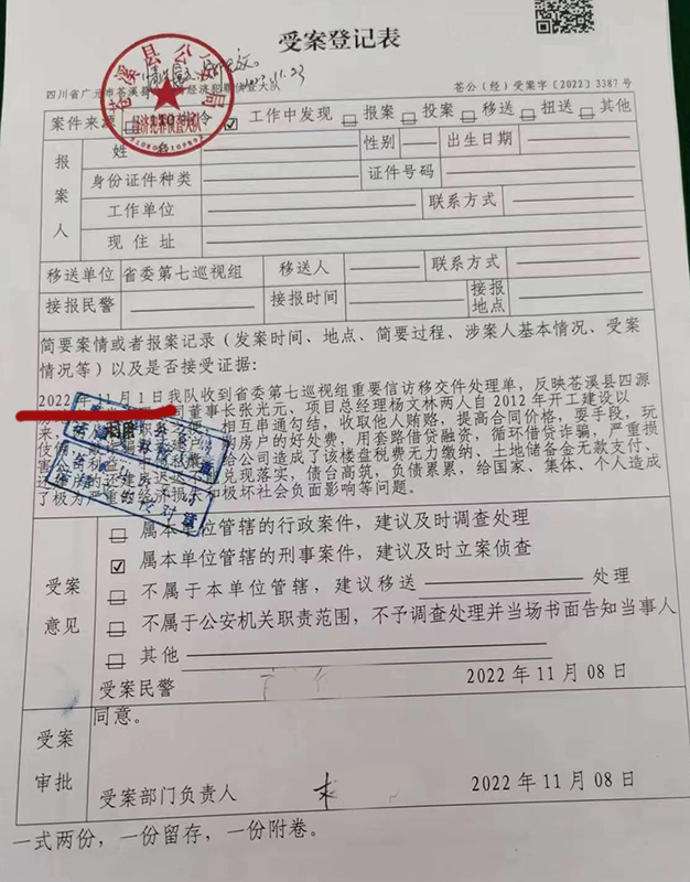 2022年11月1日,四川省委第七巡视组将群众举报移送到四川省苍溪县公安局,受案登记显示:我队收到省委第七巡视组重要信访移交处理单,反映苍溪县四源房地产开发有限公司董事长张光元、项目总经理杨文林两人自2012年开工建设以来,利用职务之便,相互串通勾结,收取他人贿赂,提高合同价格,耍手段,玩伎俩,敲诈骗取还建户、购房户好处费,用套路借贷融资,循环借贷诈骗,严重损害公共利益,中饱私囊,给公司造成了该楼盘税费无力缴纳、土地储备金无款支付、还建户的还建房迟迟不能兑现落实,债台高筑,负债累累,给国家、集体、个人造成了极为严重的经济损失和极坏社会负面影响等问题。 受案意见,属本单位管辖的刑事案件,建议及时调查处理,受案时间2022年11月8日。就在11月8日这天,苍溪县公安局经济犯罪侦查大队给四川省委第七巡视组受案回执移送报案年月日居然由2022年11月1日写成2013年10月25日。登记移送年月日就相差九年,还能指望公安机关把该案件办好吗? ![]() ![]()