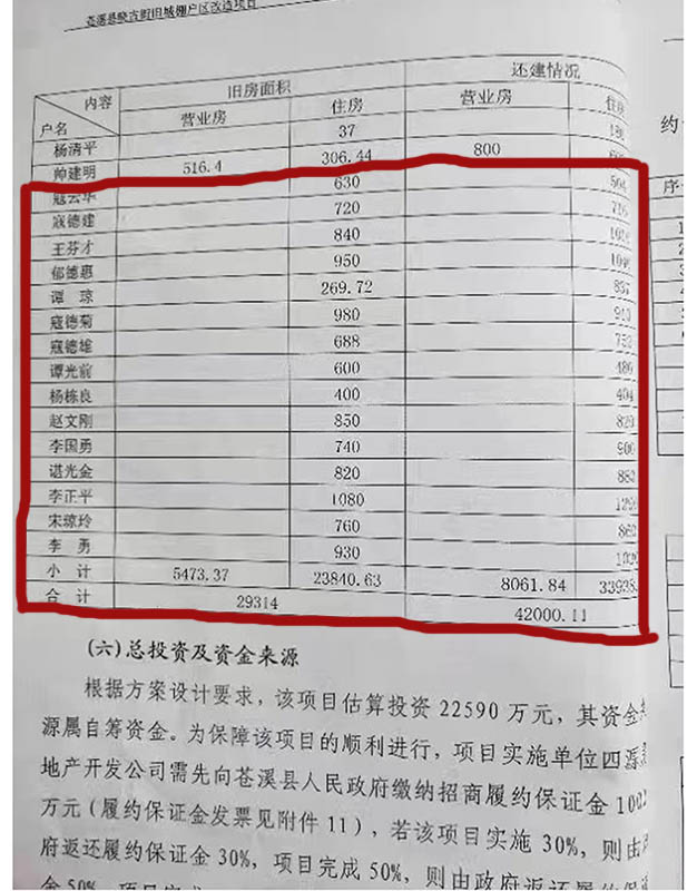 2015年1月13日,苍溪县政府信息中心网上公开,晓古街棚户区改造投资2.49亿元,总建筑面积86000平方米,其中商业17600平方米,住宅68400平方米,拆除旧房30000平方米。 2015年4月16日,苍溪县城乡规划建设局和住建局规划许可占地面积3545平方米,建设规模101053平方米,东侧地上共33层(含夹层),西侧地上共32层,地下共3层。享受棚户区改造优惠政策,免交42000平方米的政府性基金。 苍溪县人民政府根据国家对保障性安居工程奖励项目(棚改项目)有奖励(发展和改革文件)政策,投资了2400万元。这些钱根本没有用于该项,可以到现场察看。苍溪现有72个(22个棚改)项目均处于烂尾楼状态。 属于还建房罗某文、李某民、冉某蔓等6户得不到还建,导致他们无家可归。然而,从苍溪县晓古街片区棚户区改造情况统计表上看,寇德菊、寇德雄、李勇等15户没有旧房拆迁,却有还建面积一共11257.72平方米。