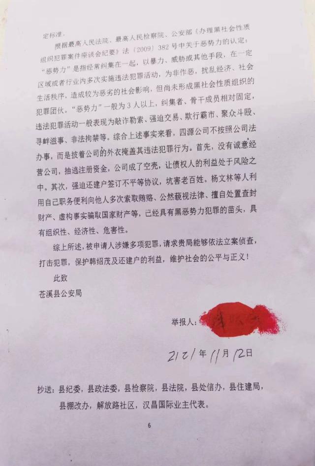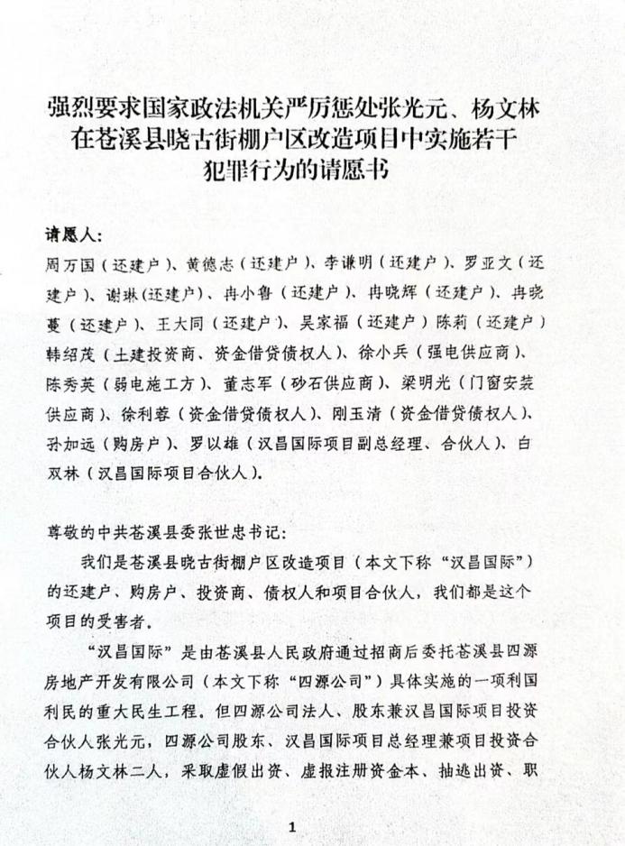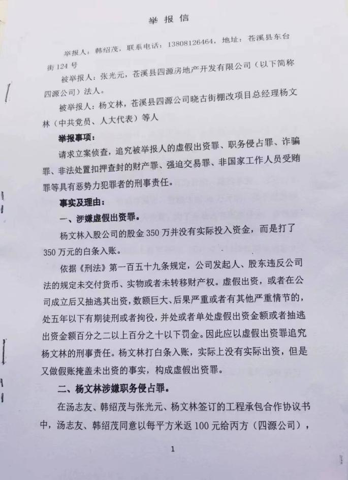 事情要从9年前说起。2013年11月18日,四川省苍溪县国土资源局在陵江镇招商引资网上公告,由自改委成员意向选择和评审小组综合评审,确定苍溪县四源房地产开发有限公司(下称:四源公司)为苍溪县晓古街旧城棚户区改造招商中选人,作为该项目房屋征收实施单位,承担房屋征收与补偿安置协议签订等具体工作。苍溪县国土局和苍溪县城乡规划建设和住房保障局按照《苍溪县旧城改造管理办法(试行)》有关规定和四源公司签订了《旧城改造招商项目委托书》。 2014年1月18日,四源公司将苍溪晓古街棚户区汉昌国际项目发出任职通知:杨文林任汉昌国际项目总经理、兼财务总监,罗某雄任项目副总经理,罗某凯任项目部经理,寇某建任项目部副总经理,杨某荣、邓某荣任项目部经理助理,寇德雄任项目部会计,张光元负责项目开发经营统筹。 韩绍茂的举报信 ![]() ![]()