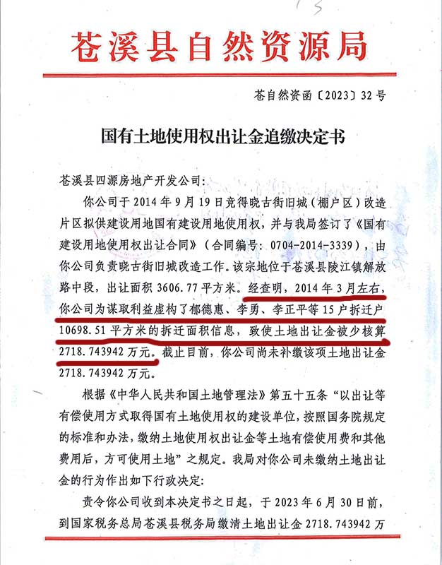 2023年5月31日,仅仅苍溪县自然资源局给四源公司下达了一份《国有土地使用权出让金追缴决定书》,经查明2014年3月左右,四源公司为谋取利益虚构了郁德惠、李勇、李正平等15户拆迁户10698.51平方米的拆迁面积信息,致使土地出让金被少核算2718.743942万元,被责令补交该项土地出让金2718.743942万元。 汉昌国际项目烂尾十年都没完工、还建房6户至今无家可归未得到解决,非还建房15户没受到处理,以及四川省委第七巡视组移送公安机关的案件也被避重就轻“了事”。 现任经贞大队长杨某伟经手一年多,也未见任何结论。希望相关部门能够从严、从重、从快给出一个调查处理结果。 特此声明:《四川苍溪县:还建房6户无家可归,非还建房15户却能入住,巡视组移送案被避重就轻》一文,由绵阳市达成电器有限公司法人徐小兵撰写发布,并承担其内容引发一切民事及刑事责任,与任何发布(转载)网络平台无关,欢迎转载、评论。 |