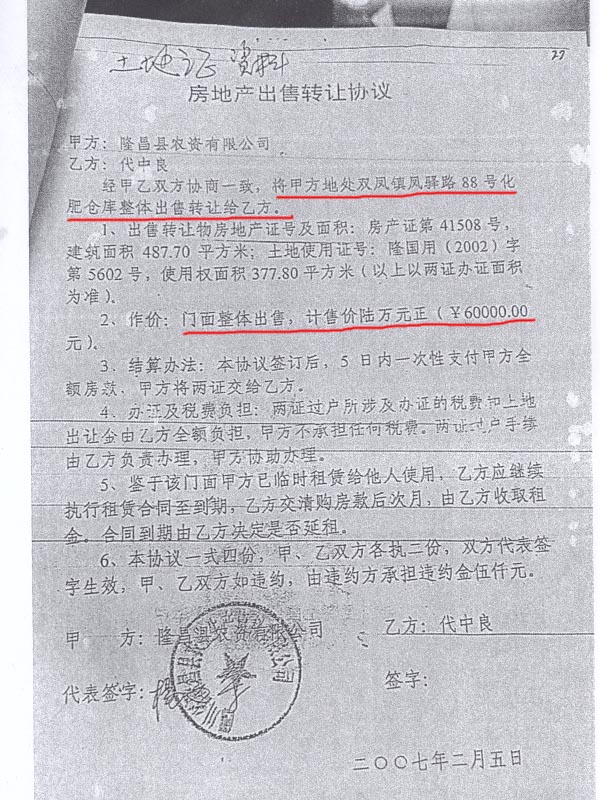 内江市生活垃圾处理中心隆昌市双凤镇安置还房项目基础设施在施工期间,损毁了代宗良大量未被征用的房屋地块、卷帘门、公用通道,长达五个多月时间,数次向镇政府反映,要求恢复未果。 2007年2月5日,当时的隆昌县农资有限公司,以计6万元的价格,将地处双凤镇凤驿路88号(现289号-293号)化肥仓库、门面,整体出售转让给李国久的丈夫代中(宗)良,房产证第41508号,建筑面积487.7平方米,土地使用证隆国用(2002)字第5602号。