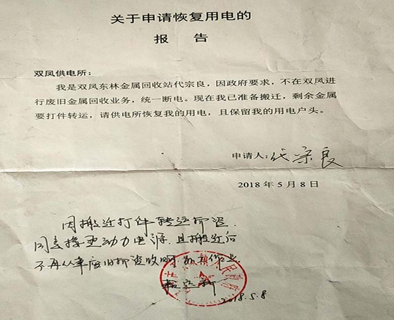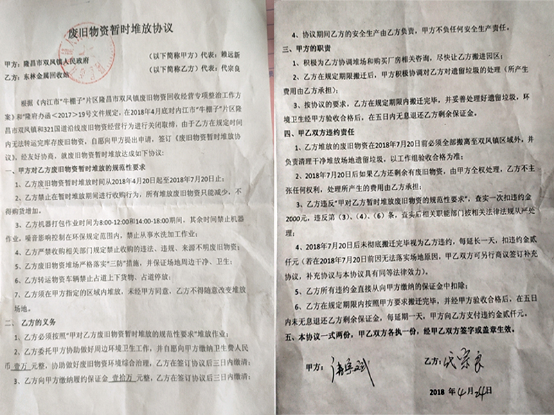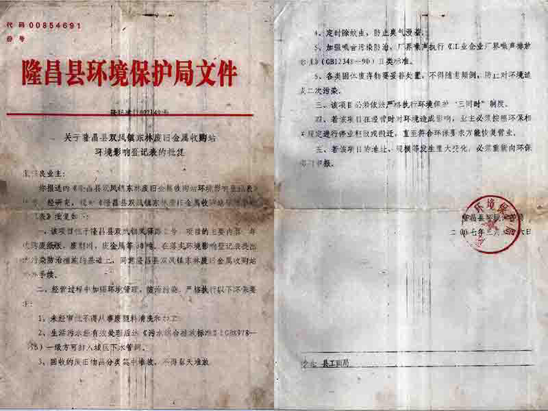 图为:房地产出售转让协议 李国久称,她家购买农资公司门面,用于收购废旧金属,隆昌县双凤镇财政所收了3000元保证金后,2007年3月16日隆昌县环境保护局才批复,同意隆昌县双凤镇东林废旧金属收购站环境影响登记,并抄送隆昌县工商行政管理局。 图为:环保影响登记表批复 同年3月28日,该废旧金属收购站正式成立,经营范围:收购、销售废旧金属、废旧塑料;销售液化气、厨具、民用建材(依法须经批准的项目,经相关部门批准后方可开展经营活动)。 图为:营业执照 2018年4月,双凤镇政府根据《内江市“牛棚子”片区隆昌市双凤镇废旧物资回收经营专项整治工作方案》和隆府办(2017)年19号文件规定,在2018年4月底对内江市“牛棚子”片区隆昌市双凤镇和321国道沿线废旧物资经营行为进行关闭取缔。 “环保局说代宗良有环保手续,不需要环保测评,最后还是被搬迁到隆昌县城区附近”,李国久说。 李国久称,双凤镇政府跟她们还签订了一份《废旧物资暂时堆放协议》,时间从2018年4月20日起至2018年7月20日止,并缴纳卫生费(费用物资垃圾清运)1万元,废旧物资暂时堆放保证金10万元。并向双凤镇供电所申请期间打件转运废旧物资恢复用电报告。 图为:废旧物资暂时堆放协议