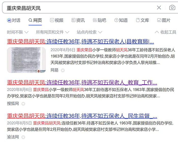 原标题:重庆市荣昌区:小学一级教师胡天凤连续任教36年待遇不如五保老人,信访办称和教委没有形成劳动关系 2019年7月16日,胡天凤在网上发表一篇文章,题为《从教36年 重庆荣昌一级教师胡天凤每月工资只有384元》,荣昌区信访办、荣昌区人社局、荣昌区教委、清升镇政府、镇教办以及维稳办相关领导进行了接访,称他们要去核实,之后一直没有结果。 图为:百度搜索早前文章