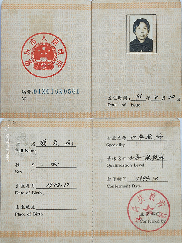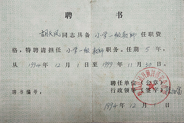 图为:荣昌县教育局颁发的小学一级教师证 1995年12月,人事部、财政部、国家计划委员会人薪发【1995】150号、川人工【1996】4号文件规定,在机关、事业单位正式工作人员中,凡1993年10月1日工资制度改革后,两年考核成绩均为称职(合格)以上的人员,可从1995年10月1日起在本职务(技术等级)所对应的工资标准内晋升一个工资档次。胡天凤也享受其待遇。 1996年荣昌县人事局荣人新发【1996】720号文件,民办教师胡天凤正常晋升一个工资档次。 1999年12月,连续任教36年的胡天凤,因家庭情况,向学校申请退休,学校还组织了欢送。 胡天凤是超龄退休,退休那年57岁。 2006年8月3日,荣昌县退休协会会长黄守钦证实,一是上级还没有给胡天凤发放退休证书,二是经济待遇上,49元经补贴没有发放给本人,并让胡天凤去镇、县教委解决落实。 2006年11月5日,荣昌县清升镇教育管理中心、荣昌县清升镇甘桥完全小学也证明胡天凤退休时未及时办理退休证,也希望上级部门办理。 图为:镇教管中心、学校证明胡天凤退休时未及时办理退休证,希望上级部门办理。
