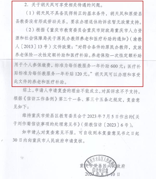 早前文章:重庆市荣昌区:小学一级教师胡天凤连续任教36年待遇不如五保老人,信访办称和教委没有形成劳动关系 图为:信访回复 2023年8月10日,重庆市荣昌区人民政府就胡天凤诉求办理退休教师应该享受的待遇和补发退休金差额作出信访事项复查意见。 复查意见书显示,胡天凤在1981年参加原荣昌县(下称荣昌县)清理整顿考试中不合格,没有取得民办教师任用证或民办教师留用证,不具备民师转正基本条件。胡天凤从事教育工作,接受所在学校的安排和管理,和原教委没有形成劳动关系。 复查意见书还显示,胡天凤要求办理退休诉求暂无政策支持,但可以办理享受一次性定额补助,每任教服务一年补助600元,用于个人参保缴费;医疗补贴标准为每任教服务一年补贴120元。 没有取得民办教师任用证或民办教师留用证不具备民师转正条件? 1981年考试,胡天凤突然生病,不能坚持答卷。后来在庭审中,才看到整顿民师情况登记表,文考情况缺级,公社意见留用,区公所意见辞退,备注胡天凤是初中文化,教学态度端正,质量效果较好,本人基础知识较差。 按照当年的政策,胡天凤连续任教15年以上,属于文化考察可适当放宽的范围。 1983年荣昌县教人发【83】339号通知,胡天凤被辞退,该辞退通知当时并未让她知晓。 川教人【1987】6号文件对当年未确认民师资格,未发给准聘证书,因多年从事民师工作,当地教育工作又需要,被留用为民办教师并享受民办教师待遇,在最近几年教材教法考试中达到合格的,可以确认其民办教师资格,发给准聘证书。 对留用民师教材教法考试不及格者,可以再给一次考试机会,达到合格的予以确认,仍不合格者要坚决予以辞退。 1990年清升镇甘桥完全小学作出《关于胡天凤同志近年来的政治表现、教育教学情况》,胡天凤同志热爱党,坚持四项基本原则,忠诚党的教育事业,自觉执行党的路线,旗帜鲜明地反对动乱,利用各种不同的活动,对学生进行形势教育,教育学生热爱党,热爱社会主义祖国。胡天凤热爱教育事业,具有良好的职业道德,能团结同志,热爱学生,以身作则,为人师表,刻苦钻研业务,教育教学效果好。该同志一直担任学校负责工作,受到领导、同事和学生家长的好评。 点校交叉统考:1989年上期,三年级语文及格率为90%,数学及格率为90%;下期,一年级语文及格率92.1%,数学及格率为95%;1990年上期,一年级语文及格率为95.2%,数学及格率为93.5%。 1993年荣昌县教育局、人社局又发了一个荣教人发【1993】5号文件,关于胡天凤同志可享受正式民师待遇的通知。工教龄从63年3月算起。 1994年9月胡天凤还被清升镇党委政府评为先进教师、 1994年12月还被清升镇甘桥完全小学聘请任期5年(1994年12月1日至1999年11月30日)一级教师职务、1994年12月还被重庆市人民政府授予为小学一级教师资格、1995年12月8日还取得了由荣昌县教育局颁发的小学一级教师证。 图为:奖状 图为:聘书 图为:市政府授予的小学一级教师资格