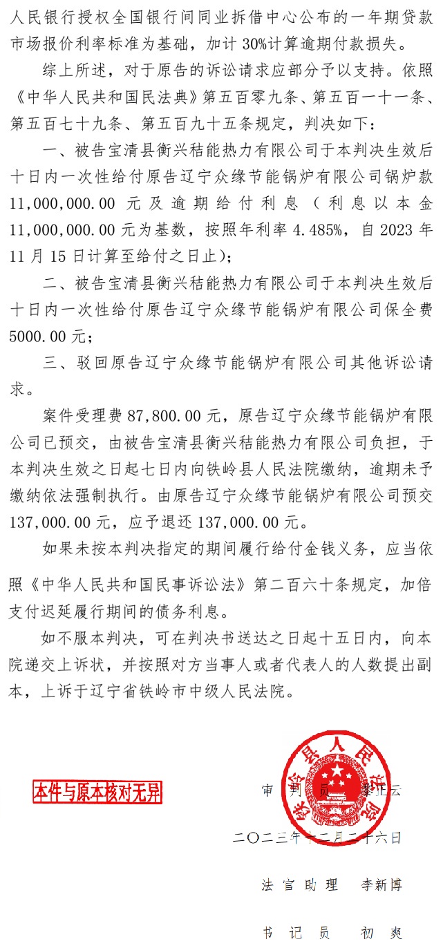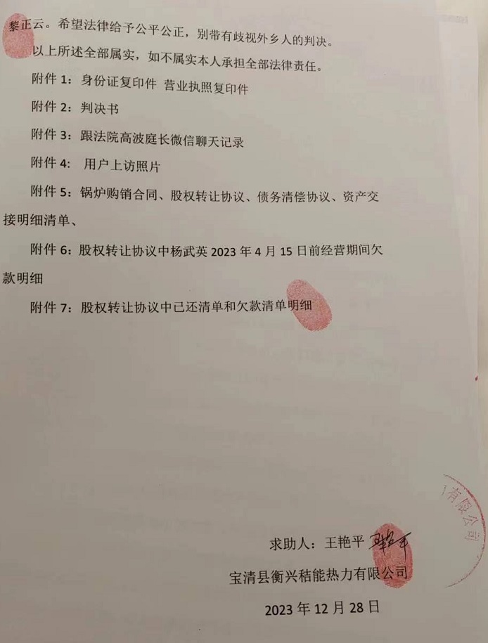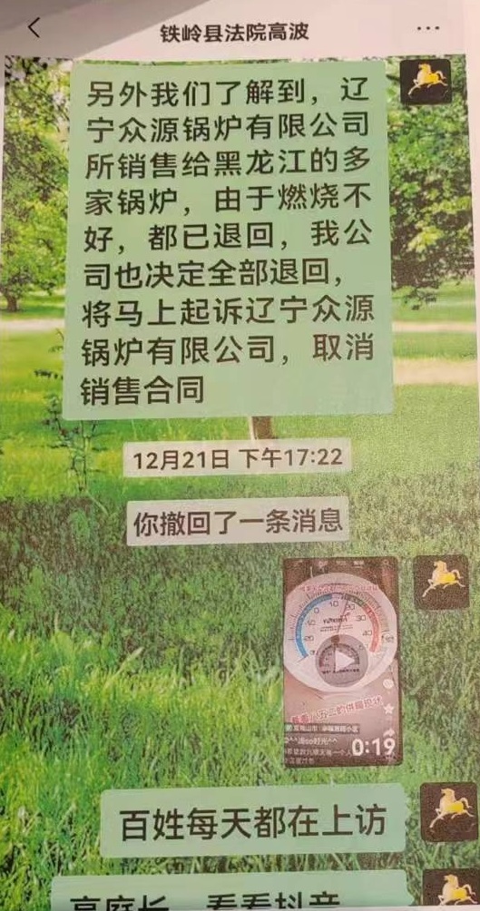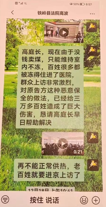 | 黑龙江民生企业投诉被辽宁法院违规查封引发群体事件 日前,法讯网收到了黑龙江宝清县衡兴秸能热力有限公司法人王艳平发来的求助信,反映公司在毫不知情的情况下被辽宁铁岭县人民法院将公司的三家银行账户各自查封1900多万后,无法购买供热燃料及无法正常经营而引起大批居民到政府部门上访并上传至抖音、快手等平台,造成极坏影响…… 法讯网全文发出求助信,小伙伴们有什么看法? 求助信 中央媒体: 我是黑龙江省宝清县衡兴秸能热力有限公司法人王艳平,身份证号码:230521197403032****,电话号码:18904691*** 我公司是为黑龙江宝清县3万多户居民供热的民生企业,于2023年11月13日被辽宁众缘节能锅炉有限公司在双方债务并未确定实际数额的情况下,以欠款为由恶意起诉至辽宁省铁岭县法院,并查封我公司三个银行账户各自1900多万元。该院在未对案件实体审查的前提下受理此案,并查封我公司账户近6千万元。 ![]() 对方起诉请求1100万元,法院却查封了建设银行的1920万元,还查封了邮政银行、农行账户各自1900多万元! 该院未下达裁定书,在11月27日我公司在购买原煤时发现账户被冻结并向银行询问原因时,银行回复是辽宁省铁岭县人民法院查封后,我们通过拨打12368查询案件主审法官黎正云法官办公室电话询问查封原因,询问后才通过短信方式给我公司下达起诉状,我公司法人王艳平询问为什么对我公司银行账户查封十天后也未通过任何形式告知我公司及我本人,经过公司法人询问,法庭黎法官回答我庭工作人员少,未能及时通知望理解,我本人认为法庭在受理此案过程中不作为、慢作为,程序有失公正。我公司向具体审理此案的该院腰堡法庭申请提供解除担保申请书,并提供了本企业价值五千余万元的资产评估报告书做担保,黎正云法官当时同意要求我方提出书面替换保全申请,高波庭长不同意替换保全申请,未被允许,后又向法庭申请由具有资质且在全国及辽宁省都有成功担保案例的担保公司对我公司账户进行反担保时,高波又以原告方不同意为由拒绝。原告保险公司可以担保,我公司提出用有资质的并有成功反担保案例的担保公司进行担保,多次跟高庭长沟通企业无法经营,热用户上访事件,高波庭长未理会。请问法庭是听原告还是听被告,这种说词能公平公正吗?根据最高人民法院出台的【民事诉讼法】第一百零七条规定:“财产纠纷案件,被申请人提供担保的,人民法院应当裁定解除保全”。该法条的法律释义:规定在征求原告方意见时,只需要履行告知程序,而非必须原告方同意。 而该庭正是以原告方不同意为由拒绝,导致我公司现无任何资金。 ![]() 极寒天气因查封无法保证温度,导致大量居民上访视频截图 购买供热燃料及无法正常经营,供热锅炉也无法正常运行,面临停热局面,近期黑龙江省极寒天气夜间气温达到零下-30~-34℃,因无燃料,当地居民室温只有零上5~10℃,居民生活苦不堪言。大批居民到政府部门上访并上传至抖音、快手等平台,给当地政府及我公司造成极坏影响,已被省住建厅通过视频会议通报,被双鸭山市住建局约谈,现恳请有关部门尽快落实12月15日习近平主席提出的保供暖、保民生的讲话。 高波庭长于辽宁众缘节能锅炉有限公司法人杨武英关系密切,影响司法公正。杨武英多次示意我本人在当地官司永远打不赢。 ![]() 经过本人多次向法庭催要判决结果才于2023年12月28日收到了2023年12月26日生效的电子版判决书。2023年12月26日铁岭法院执行庭两位工作人员到宝清县中国人民建设银行宝清支行降低查封额,由原查封1920万元降低为1100万元,部分解除了820万元。 希望中央媒体给予关注,曝光不作为、慢作为的庭长高波,法官黎正云。希望法律给予公平公正,别带有歧视外乡人的判决。 以上所述全部属实,如不属实本人承担全部法律责任。 求助人:王艳平 宝清县衡兴秸能热力有限公司 2023年12月28日 ![]() 据衡兴秸能热力有限公司查了一下,这个众缘节能锅炉有限公司在辽宁有50多起案件,基本上都是在这个法庭,且都是胜诉。而本案众源公司起诉标的额为1100万元,但法院却查封了衡兴秸能热力公司的几个银行账户达几千万元,导致公司无法运营而造成恶劣的影响,如此损失谁来承担责任?! 而对于本案的一审判决,衡兴秸能热力公司表示会上诉以维护自己的合法权益。 本网将继续关注此事的后续情况。 http://www.faxunw.com/upfiles/media/20231229101924.mp3 在只解封了800万元后,公司法人再次联系黎正云法官,在12月29日的通话录音,听听吧?! |