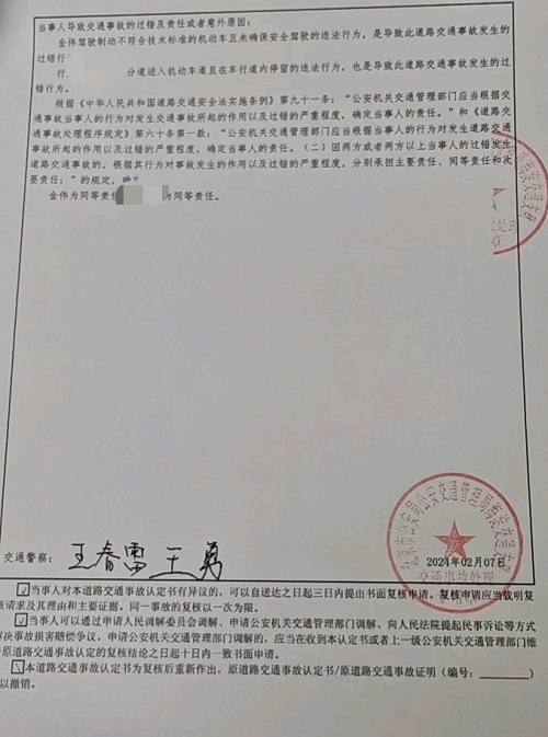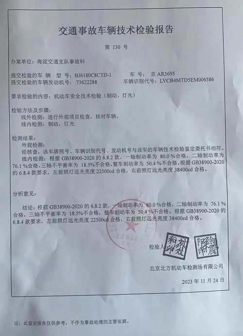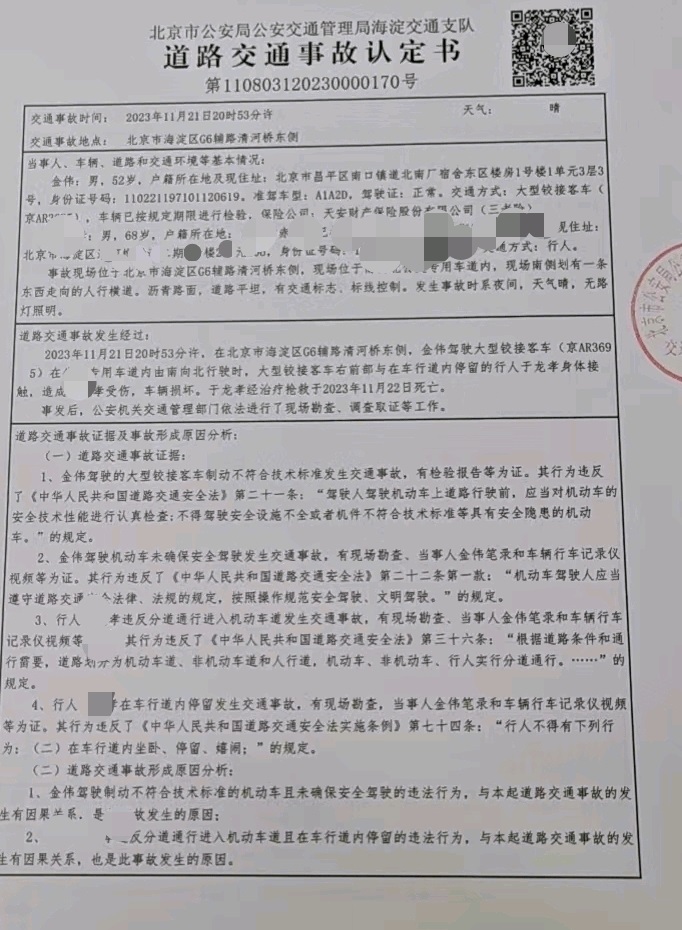 | 死者家属向媒体和有关部门泣诉: 北京一公交司机开不合格车撞人并碾压行人致死,司机和亡者咋就同等责任呢? 2023年11月21日晚,一老者于北京市海淀区遭公交车撞击并碾压数米而身亡。此事故至今已达3个月尚未处理完毕,天人两隔的死者,至今仍躺在冰冻的太平间未与火化。死者亲属泣诉:2024年2月7日,北京市公安局公安交通管理局海淀交通支队终于出具了《道路交通事故认定书》,认定肇事司机和被撞并碾压的死者承担同等责任。 据死者女儿泣诉:公交司机开有关部门鉴定为不合格的车撞人并碾压行人致死该谁担责?为啥只承担同等责任?老人突然故去已令她们悲痛欲绝,痛不欲生;同时,公交部门不仅未对死者家属给与歉意和安慰,反而于死者当晚威胁恐吓她,使她至今惊魂未定,又因之后受到二次伤害而度日如年,精神恍惚。老伴每天给死去的丈夫烧纸祈祷,死者女儿几度欲自杀随父而去。……每每谈及,死者家属泣不成声。 这种惨状该谁负责?何时能依据法规和伦理妥善解决?老人何时能九泉瞑目?亲属何日走出绝望回归正常生活?连日来,此案已引发公众高度关注与热议。 死者家属不服交管部门《道路交通事故认定书》,请求重新认定,要求肇事司机承担主要或全部责任。 死者家属对此认定书不服,死者女儿于2024年2月18日向海淀交通支队递交了《复核申请书》,请求重新认定,要求肇事司机金伟承担主要或全部责任。 《复合申请书》陈述了事实和理由,大意为: 复核请求 1、请求撤销北京市公安局公安交通管理局海淀交通支队第110803120230000170号道路交通事故认定书; 2、请求对事故形成的原因及当事人责任重新作出认定,依据事实及相关法律规定认定死者无责任或次要责任,肇事司机金伟承担全部责任或者主要责任。 复核理由 2023年11月21日20时53分许,在北京市海淀区G6辅路清河桥东侧,金伟驾驶大型铰接客车在公交专用车道内由南向北行驶时,大型铰接客车右前部与行人身体接触造成死者受伤,车辆损坏。行人经治疗抢救于2023年11月22日死亡。北京市公安局公安交通管理局海淀交通支队第110803120230000170号道路交通事故认定书认定此次交通事故形成的原因错误,划分责任错误,应依法予以撤销。申请人认为被申请人认定事实和适用法律均错误。理由如下: 一、 事发时间: 晚上20时53分,且事发地点为五环外,早已过了上下班高峰期,公交车道的专有属性已经明显降低。 二、《事故认定书》认定事故原因错误。 驾驶人金伟有多个违法行为,是导致此次交通事故发生的主要原因,应承担主要责任。 1、金伟驾驶机动车未确保安全驾驶发生交通事故。 通过当事人金伟笔录和车辆行车记录仪视频等证据,可以证明金伟作为机动车驾驶人,驾驶机动车未确保安全驾驶。其行为违反了《中华人民共和国道路交通安全法》第二十二条第一款:“机动车驾驶人应当遵守道路交通安全法律、法规的规定,按照操作规范安全驾驶、文明驾驶”的规定。此次事故发生在20时53分许,事故现场无路灯照明。经鉴定,金伟驾驶的大型铰接客车行驶速度高于27km/h,低于33km/h,可见夜间行驶在无路灯照明的道路上,驾驶人金伟未按照规定降低行驶速度,其行为违反了《中华人民共和国道路交通安全法》第四十二条:“机动车上道路行驶,不得超过限速标志标明的最高时速。在没有限速标志的路段,应当保持安全车速。夜间行驶或者在容易发生危险的路段行驶,以及遇有沙尘、冰雹、雨、雪、雾、结冰等气象条件时,应当降低行驶速度。”在事故现场南侧有一条东西走向的人行横道,驾驶人金伟通过人行横道时未降低行驶速度,也是造成本次事故的重要原因。 金伟作为长期驾驶该路线的公交车驾驶员,更应该熟知路线地形,更应该尽到安全驾驶注意义务,遇有行人斑马线,司机应当减速慢行。但是金伟并未有此操作。根据《道路交通法》第42条、44条、47条规定,夜间行驶应当减速慢行,遵守行人优先的原则。 驾驶人金伟驾驶机动车未避让行人是造成本次交通事故的重要原因,交通事故认定书中却没有列明。遗漏驾驶人金伟的违法行为,也是导致事故责任认定错误的重要原因。 2、驾驶人金伟两份笔录前后不一致。 驾驶人金伟在第一份笔录中承认看到前面十米处有人,说明驾驶人金伟明确看到路上有行人,但是没有鸣笛提醒,也未主动采取避让措施,导致了本次交通事故。其行为违反了《中华人民共和国道路交通安全法》第四十七条:“机动车行经人行横道时,应当减速行驶;遇行人正在通过人行横道,应当停车让行。机动车行经没有交通信号的道路时,遇行人横过道路,应当避让”的规定。 在发生碰撞后,驾驶人金伟未采取制动措施,导致行人被碾压拖行,是造成行人死亡的根本原因。公交车司机的驾驶证为“A本”,可想而知了解道路交通安全法的程度远高于“C本”,而且公交集团还会定期进行安全培训。驾驶人金伟撞上行人后,没有减速的动作反而在不断加速,也没有踩刹车的痕迹,持续碾压导致死者腹部闭合性损伤,多处骨折。正常人开车在路口都有减速慢行的意识,在公交站附近是人比较多的地方而且有的人为了赶车有可能会发生很多突发的情况,作为公交车司机是最了解和经常看到这种情况的。司机应该有的职业素养、安全意识反而没有做到,应依法追究金伟刑事责任。 根据金伟车上安全员的