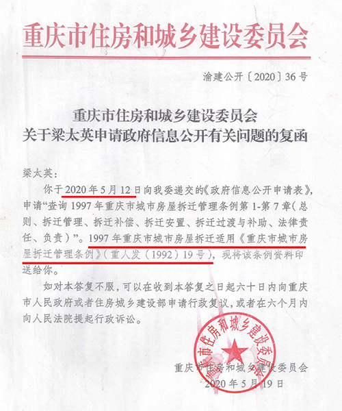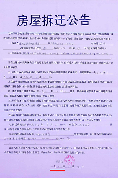 1997年,荣昌县昌元初级中学扩建校园,需拆迁昌元镇大东街106-128号、132号-140号、144号(双号)及附号、祥和路18至32号(双号)及附号等约六千平方米建(构)筑物。 3月8日,在县老干局会议室召开拆迁安置动员大会,房管局副局长张远淑(下称张局长)主持会议,说今年的拆迁政策是,各了个各的算。房管局按评估价把你的房子买过来,修好后你又按评估价买回去。 梁太英说:“我和我老公多次要求看拆迁文件,张局长说是口头传达的,没有拆迁文件。” “我是在2020年5月12日通过政府信息公开方式,才获取由重庆市住房和城乡建设委员会提供的1997年重庆市城市房屋拆迁适用的是《重庆市城市房屋拆迁管理条例》(重人发〔1992〕19号),又在2022年1月5日获取由重庆市荣昌区房屋征地拆迁中心(下称征地拆迁中心)获取的《荣昌府发〔1995〕60号关于旧城改造中商业用房的认定及安置的通知》早在1995年3月24日出台。” (重人发〔1992〕19号)。梁太英 供图 荣昌府发〔1995〕60号。梁太英 供图 “虽然在2022年调取的房屋拆迁公告显示有拆迁条例,其真实性存在问题。日期也是‘197年’3月7日,为三国时期。” 2022年调取的房屋拆迁公告。梁太英 供图 “在2007年调取的《拆迁安置补偿协议书》里,仍然没有公开当年拆迁安置补偿政策文件依据。”