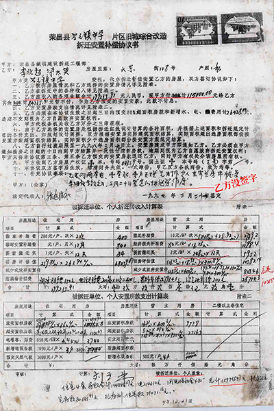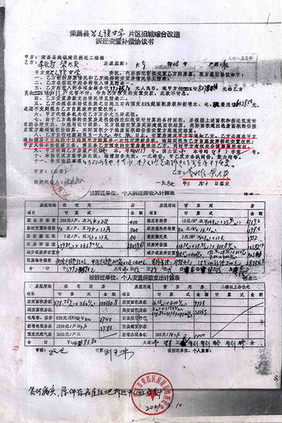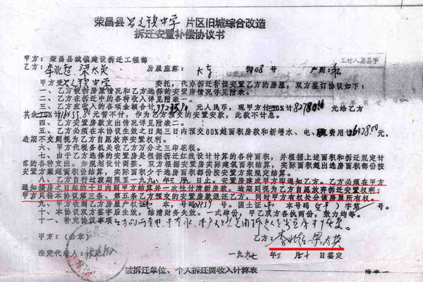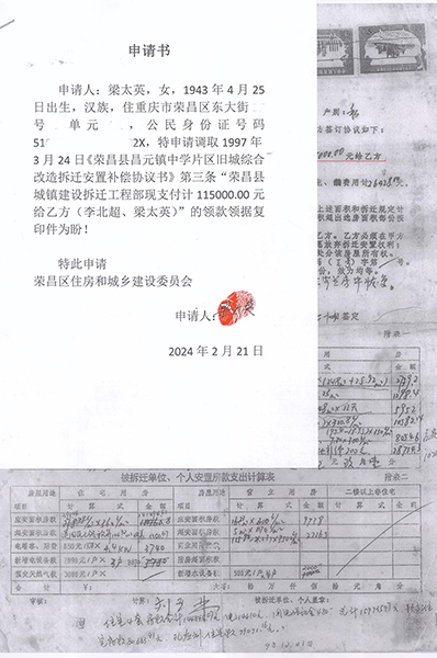 02 住宅面积109.51㎡改为259.83㎡,非住宅由397.67㎡改为248㎡(商业用房223.52㎡、其它7.34㎡、营业用房只有16.23㎡) 房管局下属部门荣昌县城镇建设拆迁工程部(下称拆迁工程部)在拆迁动员大会之前的1996年4月18日已对昌元镇大东街108号李北超、梁太英私有财产进行了现场登记查勘(下称现场查勘表)。 现场登记查勘表。梁太英 供图 梁太英说:“房屋一共三层,从2021年12月14日调取的《现场查勘表》数据计算,第一层201.685㎡,第二层195.85㎡,第三层109.51㎡,合计507.18㎡。查勘表注明,第一层、第二层为营业用房,共397.67㎡,第三层为住宅只有109.51㎡。” 查勘人黄天艳、王秀荣计算,三层合计才498.24㎡,比梁太英计算的507.18㎡少8.94㎡。最终认定有效面积为507.83㎡。 从2021年3月10日调取的1996年3月20日《旧城改造拆迁安置情况统计表》(下称拆迁安置统计表)来看,住宅面积由《现场查勘表》109.51㎡改为259.83㎡,非住宅面积由397.67㎡改为248㎡(商用房223.52㎡、其它7.34㎡、营业用房只有16.23㎡)。 旧城改造拆迁安置情况统计表。梁太英 供图 梁太英说:“一楼进门门面是摄影器材→歌舞厅→包间→舞厅厨房,53.27㎡住宅面积从何而来?二楼前面是休息室→摄影场→餐厅→天井→餐厅备料间→餐厅厨房,哪来的259.83㎡住宅面积?三楼才是住宅,四个寝室,一共只有109.51㎡。” 03 第一份协议消失,第二份协议显示被安置户“签名”却申明作废,第三份协议有效又没有被安置户签名? 梁太英说,她家拆迁面积最多,安置面积最少,1997年拆迁,1998年搬进安置房后,因安置补偿不合理,一直没有去办理房屋产权证。是2006年3月房管局的人说,‘再不去交安置房款和办理房产证,就视为自愿放弃拆迁安置权利’。这一条款也写入了《拆迁安置补偿协议书》。 “3月14日,我才到房管局把《拆迁安置情况统计表》、《拆迁安置补偿协议书》(没有签名)拿回来,第二天才到大厅产权证登记窗口交钱,交钱后工作人员将统计表和协议收回,一个星期后,带上交款收据去领取产权证的。” 梁太英说:“交钱时那份协议,是第一份协议,下方注明有补门面款38000元、住房款50928.86元,这份协议之后消失了,只有一份收据,总金额为88928.86元,” 门面、住房交款收据。梁太英 供图 “那份协议,我也看见,补门面款38000块钱,住房补多少钱记不起了。”梁太英的女儿说。 “2007年,我到拆迁中心把《拆迁安置补偿协议书》调出来看,不是第一份办产权证那份协议,下面没有注明门面、住房补多少钱了,也没有显示我和我老公(已故)‘签名’。该协议为第二份,显示日期1997年3月24日。” 第二份协议,没有被安置户签字、盖印。梁太英 供图 之后,每次调出来的都是1997年3月24日那份协议。 梁太英说:“2021年3月10日,拆迁中心田静科长说找到我们当年签名的安置补偿协议了,该份协议为第三份,显示1997年3月20日签订,又被3月24日那份协议注明作废,显示乙方李北超、梁太英姓名却不是本人签名。” 第三份协议,乙方不是本人签名。梁太英 供图 04 11.5万元领款领据变成11.0663万元交款收据,财务科档案室拒绝直接复印和发照片凭证给被安置户 1997年3月24日《拆迁安置补偿协议书》显示,乙方李北超、梁太英(下称梁太英)在拆迁中各种收入金额合计199235.91元,安置房款总计支出159735.07元,现甲方(下称拆迁工程部)支付115000元给梁太英,其余计84235.91元暂不支付,作为梁太英预交的安置房款。梁太英必须在本协议生效之日起十日内预交80%超面积房款和新增水、电费用计26428元,逾期不交则视为自愿放弃安置权利。 隐瞒文件,逾期不交款则视为自愿放弃安置权利。梁太英 供图 2024年2月21日下午,梁太英到重庆市荣昌区自然规划局档案室调取拆迁工程部支付115000元给她的领款领据,工作人员说没有,叫去拆迁中心调取。拆迁科长田静说,115000元的领款领据肯定是有的,保存在兴荣大厦财务中心,要求把领款领据申请书留下,他们调出来后通知。 调取115000领款领据申请书。梁太英 供图 梁太英来到兴荣大厦五楼财务中心,几名工作人员都说,这些领款领据2019年全部交到住房和城乡建设委员会(下称荣昌区住建委)了。 2月22日上午,梁太英来到荣昌区住建委财务科递交申请,下午两点钟又来财务科,该工作人员指着摆放在桌子上的票据说:“交给我们只有这几本,从上午找到现在,没有找到。一会田科长过来开会,叫他去中天公司查。” 下班前,敖科长在电话中说,翻遍了,查不到了,已正式告诉田科长,叫他去中天公司查一下。 “你不是说中天公司是个体吗?这些票据怎么会保存在中天公司?”敖科长说,之前的事情不太清楚。 2月23日,田科长说:“我们还在查,那边没得,我们派人过去查,他们可能不清楚。我们派人在几个地方查,还要在中天公司查。” “中天公司属于什么性质?这些票据怎么由他们来保管?”田科长说:“是股份公司,原来的拆迁代办机构。” “中天公司又有房管局的人和还有他们的家属是怎么回事?”田科长说:“那个我,我也不清楚。” 梁太英说:“1997年拆迁时,田科长已是负责旧房设施设备情况验证,难道不清楚?” 通过启信宝查询,中天房地产有限公司成立于1999年12月9日,梁太英大东街108号房屋拆迁于1997年3月,怎么将领款领据保存在两年后才成立的拆迁代办公司?该票据1997年3月至1999年3月两年期间又存在哪里? 2月26日,田科长递给梁太英的不是115000元领款领