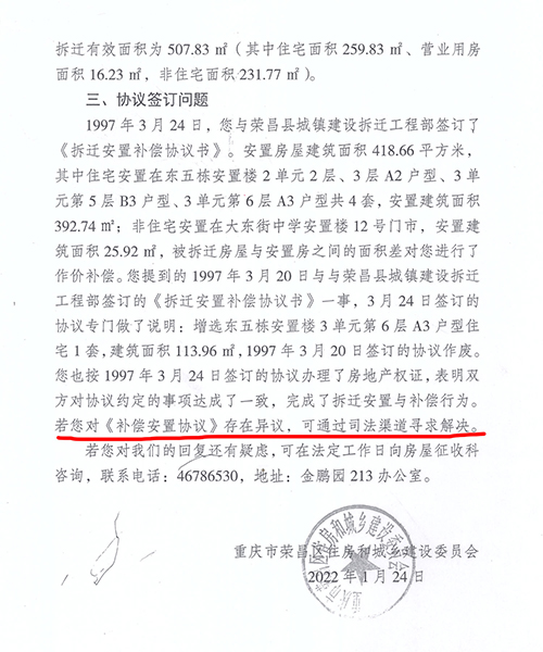 荣昌区住建委在信访回复中提到:“根据你户于1997年3月24日与拆迁人‘荣昌县拆迁工程部’达成了补偿安置协议内容,你户与安置房之间的面积差,以‘减少或放弃安置费’进行了作价补偿。故我委认为你户的拆迁补偿不存在隐瞒、霸占你户的合法财产。我委认为拆迁当事人双方已经达成补偿协议,表明双方对协议事项的约定成立,完成了拆迁安置与补偿行为。” 梁太英说:“1997年3月24日那份《拆迁安置补偿协议书》2007年才调取到,是有一项减少或放弃安置费,该协议没有我们签字、盖章,当时是因为房管局工作人员说,如果还不去结算并付清款,逾期则视为我自愿放弃拆迁安置权利,并退回预交的安置房款,他们还有权处分房屋所有权,在万般无奈的情况下,我才在2006年交了88928.86元,把房产证领了。” 信访回复还提到,梁太英若对《拆迁补偿安置协议》存在异议,可通过司法渠道寻求解决。