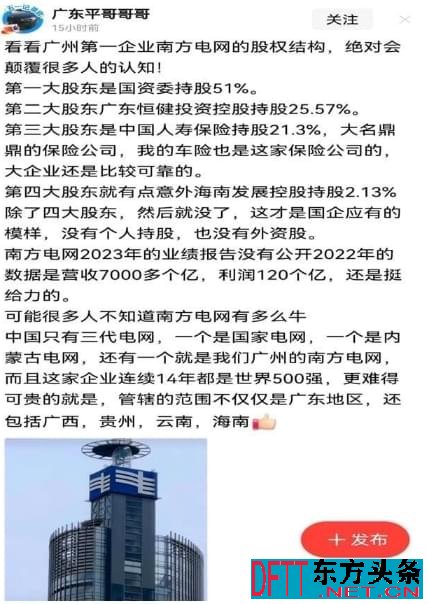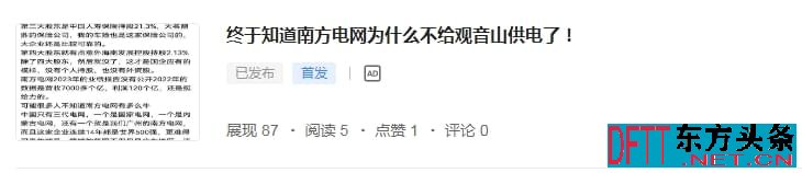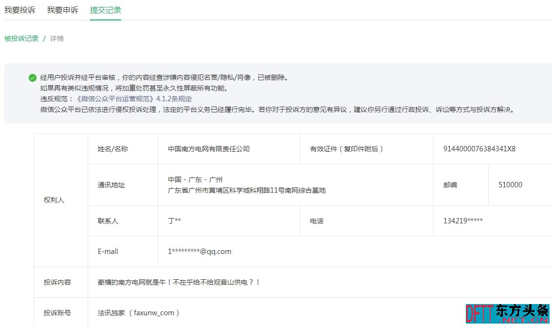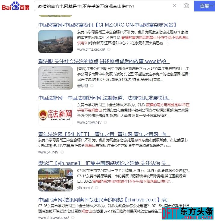 南方电网,果然豪横无耻! 法讯君在6月27日发布了《豪横南方电网就是牛!不在乎给不给观音山供电?!》,文章指出了南方电网的牛、豪、横、羞、耻。 网友说南方电网的牛气。 为什么南方电网不并入国家电网?AI答复是这样的,如此也可以看出南方电网的牛气之处。 而南方电网的豪自不用说:2022年《财富》世界500强,中国南方电网有限责任公司位列第89位。而看了这个股权结构,更是明白了南方电网确实牛:一年利润120亿以上,有钱!中国南方电网有限责任公司党组书记、董事长孟振平多次刊发《人民日报》刊发署名文章。南方电网的各种信息也频繁在《人民日报》出现。 南方电网的横体现在一是强行违规在国家森林公园内架设高压线。南方电网的横体现之二在于强行违规在观音山架设五组高压线塔给黄淦波、观音山公司带来巨额损失,却漠视其诉求不予任何补偿! 南方电网的横之三在于25年不给用电企业供电、限电,上百家媒体关注报道也无济于事。 南方电网的羞体现在说假话,天天做表面文章,当别人都是傻瓜,对照其言行不一感觉就是笑话!文章说其企业文化宗旨是人民 电网为人民。但观音山需要供电,为游客服务!你拒绝供电25年,多方呼吁都置之不理,做到了为人民吗? 文章还指出2023年12月7日的《人民日报》,南方电网宣称“坚持守护绿水青山 服务好人与自然和谐共生的现代化”,观音山公园被你们破坏得满山沧桑,隐患重重,每年过百万游客的安全被你们漠视,你们,怎么坚持守护绿水青山?!而在今年2月29日的《人民日报》报道称中国南方电网正在全力打造“南网在线”智慧营业厅,积极探索“基础+增值”用电用能新业态,努力做好群众用电业务办理 “一次都不跑”。那么,东莞观音山公园为申请供电跑了25年,你们是怎么做好用电业务办理的呢? 南方电网的耻体现2023年上半年,南方电网问题干部员工主动投案的人数达56人。而在2015年出现的东莞假供电局长尹文胜受贿1800万元也让人无法置信,可以说是南方电网的一大丑闻吧! 南方电网的腐败非比一般,丑闻不断! 文章还点出南方电网的羞除了这些腐败人员外,2023年的“广东供电局员工妻子炫富并举报丈夫行贿30万元入职”事件更是闹得沸沸扬扬,全网皆知。 文章作者认为:电老虎一家独大,虽然人们没有选择用电企业的权利,但是广大人民群众可都是看在眼里的,他们心里可敞亮着呢!观音山供电问题表面上看是南方电网欺压民企,但实际上不仅仅是企业或个人供电需求,而是广大游客们的实际需求!南方电网可是从事国民经济的基础产业和国计民生的垄断型公用事业的,真心希望南方电网要点碧莲,切实履行人民供电为人民的企业宗旨!文末说:中国有句古话叫知耻而后勇,不知长期在电力系统任职的孟振平董事长能否有所作为?!是不是金玉其外? 该文发出后的当天下午5时许,有自称是南方电网宣传部门人员,加法讯君为好友,欲咨询相关信息。 在18:30,法讯独家收到了腾讯的侵权投诉,称是“内容侵犯名誉/商誉/隐私/肖像”,并表示“侵权投诉审核中,平台会在7个工作日内审核处理,你可以在审核结束前作出本次投诉确认。主动确认侵权可减轻处罚。” 但在19:53,微信公众号即发来通知,确认“你的内容经查涉嫌内容侵犯名誉/隐私/肖像,已被删除”。 微信公众号的动作之快,实属罕见!因为之前被投诉时,基本上都是5天左右才确定。这次删除文章,根本就不给作者提供申诉的时间。 不但如此,在国内备案的一些网站也收到了当地相关部门的通知,要求删除转载的该文章网页。 有重庆网站转发了,在6月28日中午收到了属地网信办的通知,告知是12377平台举报的,市级转交下来的,要求删除。网信办人员说《豪横的南方电网就是牛!不在乎给不给观音山供电?!》,文中多处报道与事实不符,相关信息如下:一是文中“(南方电网)不但不主动发展客户,反而还拒绝给广东观音山国家森林公园供电,时间已长达25年!”实际为观音山森林公园于2003年以樟木头镇人民政府名义报装1台315千伏安容量的变压器供公园“会展中心”使用;于2009年经产权方石新社区同意,观音山森林公园开发有限公司以租赁户身份再报装1台315千伏安容量的变压器用电,东莞供电局依法依规受理该申请,根据《供电营业规则》第四十七条,供电设施的运行维护管理范围,按产权归属确定,具体分界点由供用双方协商确定。经查,与观音山森林公园开发有限公司签订的《供用电合同》已约定产权分界点,东莞供电局已按约定供电至观音山森林公园用电地域范围,至今一直正常用电,不存在25年没有享受到市政供电的情况。另外还存在4点不实之处,篇幅有限,详见举报材料。同时告知举报材料还没有下载下来。 在6月28日15:52,某网站负责人接到了保定某居委会的电话,说是转发的文章需要删除,上级部门联系不上才通知居委会的。 重庆和河北保定转发该文的几个网站于是都无奈而删除。 网易号“法询独家”发布的《终于知道南方电网为什么不给观音山供电了!》在展现803次后没有通知,直接下线! 百家号也是直接下线,没有任何通知 今日头条没有下线,但就是不能分享 删就删吧,知道存在问题解决就行。在南方电网宣传人员联系法讯君时称想了解情况时,原以为情况很清楚不用了解,会解决问题的。但如今二个月过去了,法讯君联系广东观音山公园负责人,回复是南