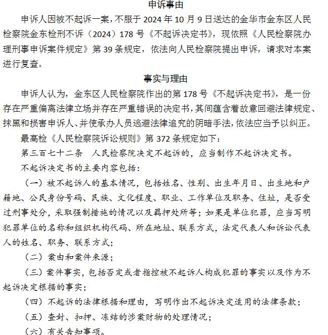 发布在镇政府门口下跪视频 村民被抓捕 经三次庭审 检察院撤案 独立撰稿人 李海波 近日,浙江金华市金东区傅村镇村民沈大庆等人来到北京,向知名刑辩律师贾霆表示感谢,他说,他被当地司法机关关押了17个月,眼看就要被定罪判刑,贾霆律师介入后力挽狂澜,最终检察院不但撤诉了,还在上个月作出了不起诉决定! 然而,贾霆律师却表示,自己并不是沈大庆的辩护人,而是其同案被告人吕肖琴的辩护律师。这个案子最终能做到无罪,首先是因为案件本身存在问题,当事人的行为不构成犯罪;其次是因为当事人自己的坚持;依法为无辜的公民辩护,乃是律师的天职。 这起案件源于镇政府施工挖断村民水管28天未修复,残疾村民多次向政府反映无效后,带着九旬父母到镇政府门口下跪,最终被抓捕。 金东区傅村镇是诗人艾青故里,民风淳朴。但自章淑剑担镇书记以来,为了自己的政绩,在没有审批的情况下,以土地流转的方式破坏四百余亩基本农田和林地,村干部违纪违法成风,为此引起群众不断举报…… 沈大庆的抖音号,原来的号被封杀 老举报人与弱势户 在求助镇政府中相遇 出生于1967年的沈大庆是举报人之一,原来经营一家装修公司。他因多次举报村干部多种违法违规行为,镇政府都没有给予答复,为此他在抖音上多次发视频举报。 1961年出生的吕肖琴是深塘坞村人,32岁时一场车祸使她致残,她决定不再嫁人,留在村里身边照顾年迈的父母。1998年,她妹妹吕月琴已出嫁,两个弟弟一个因病死亡、一个智力残疾,家人纷纷指责吕肖琴是扫帚星,而患精神病的弟弟经常暴力殴打她,无处栖身的她只得借宿亲戚朋友家,有时还在寺院里住上一段时间。为此她不得不把自己的户口独立分出,然后陆续十几次向村、镇有关部门申请批地建房,但均因村里有宅基地“批男不批女”的规定而无法通过。经吕肖琴上访后,金东区两任区委书记分别作出批示,要求傅村镇帮助解决吕肖琴住房困难问题。 深塘坞村村委会曾在2011年6月1日吕肖琴写的批地建房申请报告上盖有印章。 2014年4月,《浙江日报》“佳友民情快车”栏目刊发了《54岁不婚农村女申请宅基地遭拒 吕肖琴:我想有个家》、《未婚女批地建房有转机》连续报道了吕肖琴申请宅基地16年,一直没有通过审批的遭遇。 该村村委会在2019年6月6日吕肖琴填写的《金东区农村村民(居民)建房申请审批表》“村委会意见”一栏盖印,还有该村现任村党支部书记傅得志的签名。但不知何故,傅村镇政府一直没有给她办理用地审批手续。 2011年春节临近,吕肖琴在自家菜地上建了一栋90平方米的简易房作为栖身之所,简陋到没有水、电。直到2016年下半年,在她和母亲多次申请(跪求)下,镇政府为其接通了水电设施。2017年9月,吕肖琴父母的老宅被傅村镇政府强行拆除。为此,她父母提起行政诉讼,虽然镇政府被兰溪市人民法院行政判决书确认为“违法强拆”,但拆掉的房屋却无法恢复原状,无处居住的两位年迈老人只得居住在吕肖琴家里。 2022年10月上旬,通往她家的自来水管被镇政府某工程项目施工挖断,停水近1个月未修复。一家4口只得拖着老弱病残之躯,每天到数百米外的村里去提水解决生活之需,步行来回要20多分钟,就连村长也帮忙提了4、5次水。为此,吕肖琴与母亲多次向镇政府、区信访局反映, 但村、镇两级政府均以该处住宅系违章建筑为由不给修复水管。镇政府曾提出,维修水管的1万元费用要她家负担一半,但吕肖琴认为,上届政府为她家接上了自来水,本届政府施工挖断了,理应为其修复供水,维修费用不该由她家承担。 10月的一天,沈大庆在镇政府的一次举报中认识了吕肖琴,由此他了解到吕肖琴家是老弱病残户,生活用水已被停了二十余天,吕肖琴每天像在镇政府上班一样,在镇委章淑剑、朱凯祥书记办公室门口要求解决生活用水问题未果。 拍视频发抖音后问题解决 几个当事人却被刑拘 几天后,沈大庆路过吕肖琴家,发现镇里仍未给其家恢复供水。古道热肠的沈大庆认为就算是违章建筑,政府也有义务维护老百姓的基本生存权。 熟悉装修工程的沈大庆认为距离吕肖琴家直线距离数十米外的公园公厕就有自来水源,架接到她家成本估算只需1000余元,而傅村镇政府舍近就远架接费用高达1万元,这不合常理。在与吕肖琴姐妹聊天中,沈大庆听说吕家几年前的自来水管是吕肖琴的母亲找到镇政府领导下跪后才给安装的,于是将吕肖琴母亲提水的场景拍成了视频,并建议吕肖琴的母亲再次到镇政府跪求领导。 11月3日是吕肖琴家自来水断供的29天。上午八点多,吕肖琴搀着年迈的父母,在宽达7米有余的傅村镇政府大门外的通道中间跪下,并举着一个写有“请章某某书记给点水喝”的木牌,引起了部分群众的围观。此举再次被人拍成视频,连同之前她母亲提水视频,经沈大庆编辑后一起发到抖音上。 11月4日,傅村镇政府立即派人维修水管,恢复正常供水一直拖延到11月19日,吕肖琴家自来水断供长达40余天! 吕月琴家水管虽然被修复了,但之后吕肖琴、沈大庆及其他参与拍视频发抖音等相关人员,均被傅村派出所传讯。11月中、下旬,金东区公安分局以涉嫌寻衅滋事罪分别对沈大庆、吕肖琴、吕月琴等4名涉事人员刑事拘留(其中1人另案处理)。 沈大庆因涉嫌寻衅滋事罪,于2022年11月18 日被刑事拘留、12月22日被逮捕,直到2024年4月17日才被金东区人民法院取