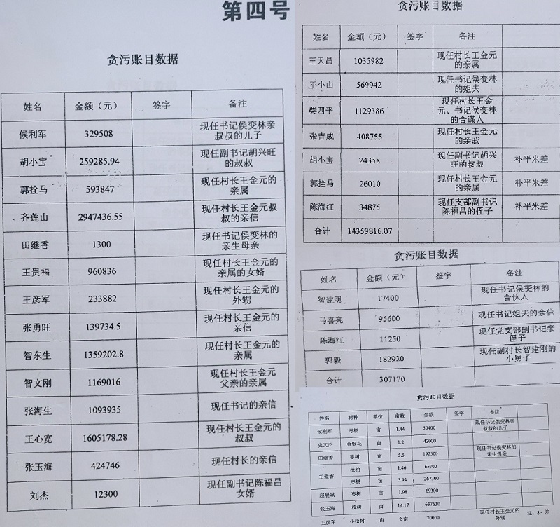村民们反映2009年侯鸿森担任村支书,2011年开始侯便让穷迫村民王金元和高利贷者柳江武认识,之后柳在4月份陆续汇给王2千万元左右,6月又汇给王金元3千余万元。王金元开始花钱请村民吃饭、给每位选他的村民一千元,到11月王金元顺利当选为村主任,为此王花了上千万元!从此侯鸿森开始大肆侵占使张村集体财产;随意挥霍村民土地补偿款,短短几年,村委会办公楼就修建盖过三次,并斥巨资进行了内部装修……如今村委账面负债累累;十多户村民拆迁了房子征收了地的款项在村支书侯鸿森监管下 从“账面”消失,生活陷入困境。