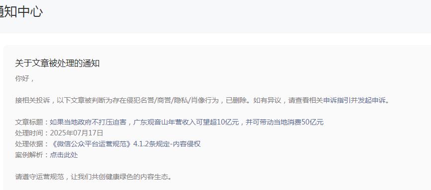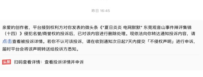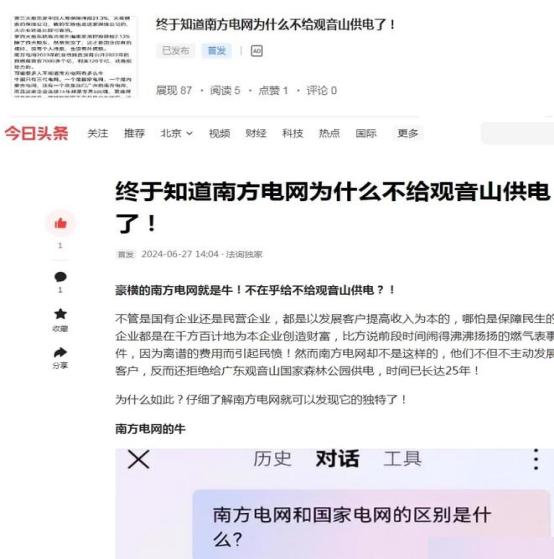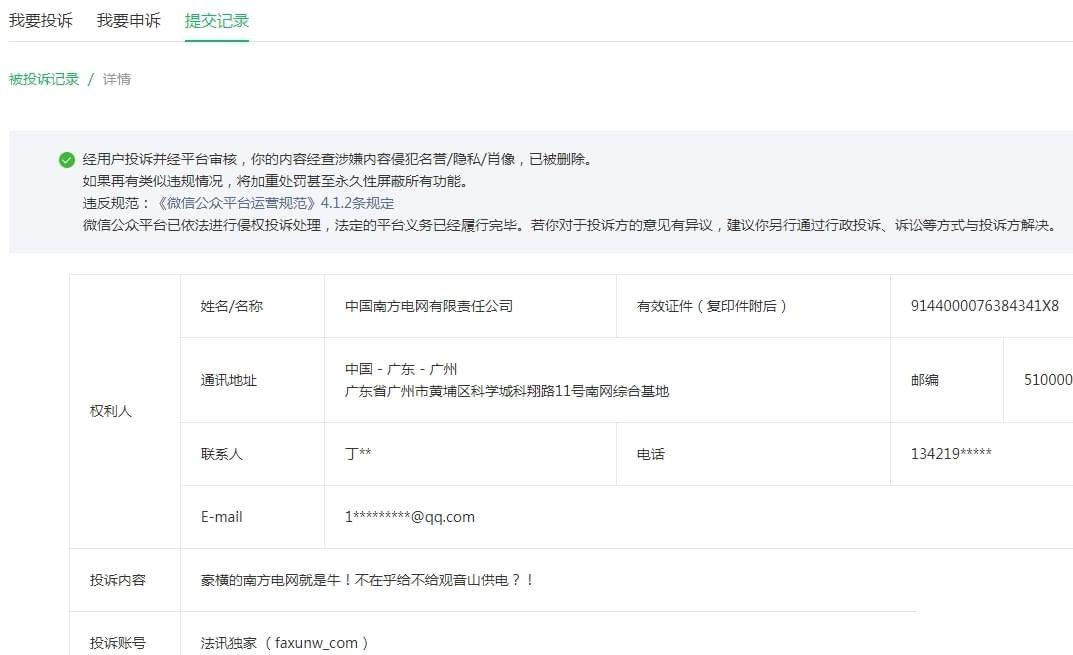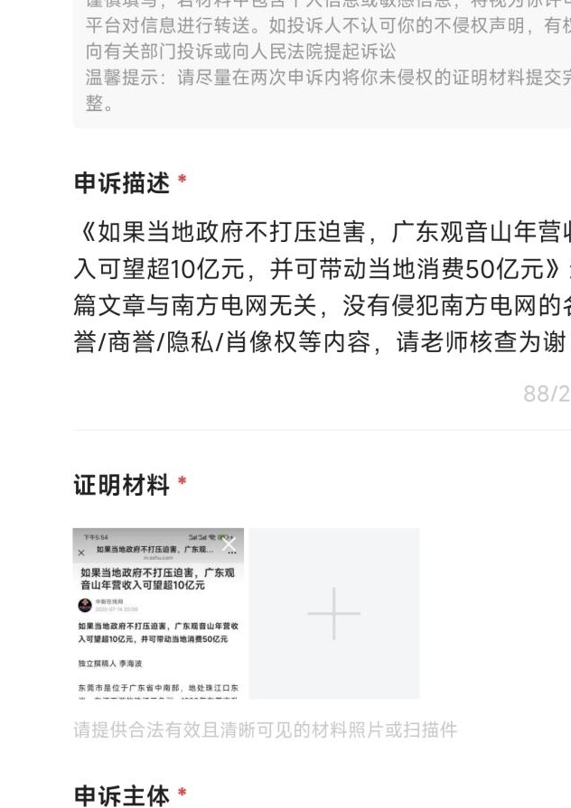 | 南方电网,删帖招数不断为哪般 孟振平董事长可知:南方电网删掉的是帖子,失去的却是人心 独立撰稿人 李海波 日前,撰稿人登录今日头条后台发现,发布的《不打压迫害,广东观音山年营收入可望超10亿元》被投诉删帖了。而投诉人却是广东电网公司东莞供电局! ![]() 东莞供电局的举报描述是:“从2014年起,观音山公司多次通过各类平台发布不实信息。其中,针对供电部门的不实舆情主要为公园供电受阻致26年来近80%区域依赖自发电、供电部门擅架线塔侵权,以及倒推涉电安全隐患责任等内容。事实上,自2003年起,东莞供电局便一直向公园提供供电服务。根据《供用电合同》将电力供应至公园的产权分界点。在高压线塔架设纠纷中,观音山公司三次诉讼均败诉,法院认定线路建设早于公四承包经营,未构成侵权。而涉电安全隐患是公园经营方擅自在1995年建成的110千伏线路下方修建栈道所致,东莞供电局已向公园发出整改通知,其拒绝签收且拒不整改,鉴于相关文章存在不良舆论导向,致使不实内容广泛扩散,已对我司企业形象造成影响,恳请及时删除、屏蔽相关链接。” 明明是写观音山的发展情况,怎么就牵涉南方电网了呢? 于是撰稿人仔细查看了这篇1万余字的文章,发现了又这么100字提及了南方电网问题“特别是南方电网属下的东莞市供电局拒绝给公园供电:2020年12月22日央视《谈事说理》栏目播出专题“《谈事说理》之搁浅的公园”其中就着重谈到观音山国家森林公园悬而未决的基本供电问题,之后全网和知名专家为之呼吁至今仍未解决。”同时配了一幅网文截图。 ![]() 微信公众号的该文也被下架 ![]() 值得疑惑的是,微信公众号“被投诉记录”里却没有相关信息 如此小题大做的投诉删帖,看来是南方电网又来当东莞当地的打手,来混淆视听吧?! ![]() 明知道申诉没有结果,但法讯君还是按照程序在17日的17:58提起了申诉。自己的权利,总归还是要争取的,至于今日头条这些平台只为自己利益着想,那就随他吧! 在当天晚上23:23,今日头条对撰稿人的申诉有了答复:亲爱的创作者,你提交的「不侵权声明」单号6115714不符合法定要求,原因:你的申诉理由不充分。如你认为被投诉文章不存在侵权,请具体明确指出,并针对投诉理由作出回应、提交对应证明材料。若需要补充举证,请在收到通知次日起7天内点击提交「不侵权声明」。 ![]() 今日头条后台,某创作者也是这样被通知下架的。 ![]() 除了撰稿人的帖子被南方电网东莞市供电局删除外,也有其他媒体人的今日头条帖子《“夏日炎炎电网默默”东莞观音山事件辣评集锦(十四)》被同样理由删除。 看看东莞供电局的删帖理由,挺奇葩的吧!申请理由严重不实! 一是“从2014年起,观音山公司多次通过各类平台发布不实信息,其中,针对供电部门的不实舆情主要为公园供电受阻致26年来近80%区域依赖自发电、供电部门擅架线塔侵权,以及倒推涉电安全隐患责任等内容。”,纵观观音山事件,发布的网络平台包括媒体,有中央电视台、人民日报、人民网、光明日报、经济参考报等中央媒体呢!他们发布的是不实信息?!![]() 公园自主发电机房,年支出是市政供电的3、4倍! 二是“自2003年起,东莞供电局便一直向公园提供供电服务”,但观音山公园没有说供电局没有完全供电,而是在公园区域有80%没有供电,26年来向东莞供电局申请全员供电而被推诿拒绝吗?还有在2021年7月18日,根据樟木头镇委书记指示,樟木头镇供电局刘书记、经发局领导和观音山公园再次召开用电协调会,经发局作为牵头让用电服务中心跟观音山对接,具体落实解决。会上经发局领导直接打断管委会主任汇报说的珠海因为无电引起安全事故省长都去现场的话,直接问需要多少电,上哪里?陈主任答复第一步就是山顶供电如果有一定困难,可以先把会展供上电;第二点是解决餐厅、沿途路上的照明,还有办公室、庙里。其实观音山和庙里是两个单位。在经发局领导中途离场后,双方又对高压线问题进行沟通,最终刘书记答复暂时解决不了而离开……会议纪要显示的该情节,如果不是拒绝供电,刘书记会参会吗?! 三是“根据《供用电合同》将电力供应至公园的产权分界点。在高压线塔架设纠纷中,观音山公司三次诉讼均败诉,法院认定线路建设早于公司承包经营,未构成侵权。”就此案件,多位法学专家认为:案涉四条高压线路的真实初始修建时间和是否为观音山公司承包前就已存续存在一定争议,一审、二审法院直接认定属观音山公司承包前已存续或变更升级改造而来是否得当?为何观音山均败诉?法院认为这些高压线并未架设在公园的红线范围内,故供电部门没错。而公园提供给法院证明高压线确实架设在公园范围内的证据文件《观音山国家森林公园总体规划》以及各工程施工的时间等均未被法院认可。出现这种结局,如果说此案没有行政力量干预司法,鬼都不信! ![]() 安全隐患是南方电网非法架设的高压线塔,看看,危险不?! ![]() 国务院新闻办主办的网站发布的这也是不实信息吗? 其实,东莞供电局胡言乱语不是一时失误,而是有先河的。 2023年5月19日,广东观音山公园向中央巡视组提交了题为《南方电网对东莞民企的伤害有多深?社会影响有多坏?》的情况反映材料。之后东莞供电局进行了不实回复,观音山公园于11月1日给广东省纪委递交了书面材料《关于东莞供电局20