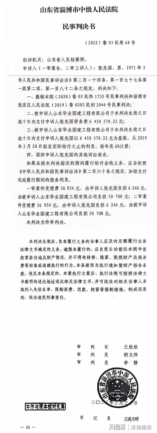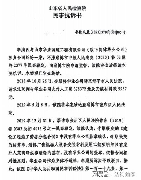 同案不同判,包工头向巡视组控诉淄博中院法官枉法裁判 独立撰稿人 李海波 同案不同判是指案情相似的案件因法律适用标准或裁判尺度不统一而导致不同判决结果的司法现象,其根源涉及法律体系、自由裁量权、案例指导制度等多重因素。同案不同判一般是在不同法院有相似案件存在不同判决。然而撰稿人发现同一个项目相似的合同纠纷在同一个法院,且都被省检察院抗诉的情况下竟然出现完全不一样的判决,这种匪夷所思的事情,就发生在淄博市中级法院! 近日,山东滨州市的李朋向法讯君投诉称他遭遇了淄博中院典型的“同案不同判”,淄博市中级人民法院此举严重破坏了法律适用的统一性和司法公信力。 李朋在7月23日,向中央巡视组控告了山东省淄博市中级人民法院民三庭庭长倪玲玲,请求追究在民事案件中办关系案的违法违纪行为。 承包劳务合同被欠薪 起诉却被驳回 2019年6月,李朋起诉华业公司劳务合同纠纷,2019年12月31日,淄博市张店区法院下达[(2019)鲁0303民初4016号之一]民事裁定书审查认为:原告提交的《建设工程施工劳务分包合同》中没有被告盖章确认,原告提交的结算单、淄博广青机器人邻舍安装材料及用工款项明细只有案外人范明峰或李继森的签字,没有被告的盖章,依据合同相对性原则,被告主体不适格,原告所诉应予以驳回。据此,依照《中华人民共和国民事诉讼法》第一百一十九条、第一百五十四条第一款第三项,《最高人民法院关于适用《中华人民共和国民事诉讼法》的解释》第二百零八条第三款之规定,裁定:驳回原告李朋的起诉。 那么华业公司和范明峰是什么关系?在中国经营报2021年1月9日《淄博一市重大项目疑陷“套路建”当地人士称多家公司受害》的报道里有这么一段话:“2017年4月,广青公司与山东华业国建建筑工程有限公司(以下简称“华业国建”)签订了《广青机器人生产车间、办公楼施工协议书》,广青公司代表杨光营和华业国建时任项目经理范明峰分别签字加盖公司公章。”也就是说项目合同有华业公司的公章,证明范明峰是华业公司的项目经理! 省检抗诉一审判决胜诉 二审再遭驳回 李朋不服淄博中院的这份终审判决,于是向检察机关申请监督。 山东省人民检察院认为淄博市中级人民法院作出(2020)鲁03民终2377号民事裁定适用法律确有错误,山东省人民检察院在2022年6月26日向山东省高级人民法院提起抗诉,山东省高级人民法院作出(2022)鲁民再285号民事裁定书,裁定撤销(2020)鲁03民终2377号和(2019)鲁0303民初4016号之一民事裁定,指令淄博市张店区人民法院审理本案。 2023年3月6日,李朋再次就该案进行立案,张店区人民法院作出(2023)鲁0303民初2433号判决书,判决:1.被告山东华业国建工程有限公司于本判决生效后十日内向原告李朋支付人工费 378372元;2.被告山东华业国建工程有限公司于本判决生效后十日内向原告李朋支付安装材料款9957元;3.被告山东华业国建工程有限公司于本判决生效后十日内向原告李朋支付安装材料款利息损失(以388329元为基数,从2018年6月18日起到2019年8月19日止,按照中国人民银行同期贷款基准利率计算的利息17497元;从 2019年8月20日起至到2023年4月20日止,按照同期中国人民银行授权全国银行间同业拆借中心公布的一年期贷款市场报价利率计算的利息54458元;自2023年4月21日起至实际付清之日止,按照同期中国人民银行授权全国银行间同业拆借中心公布的一年期贷款市场报价利率计算的利息。 2023年3月份,张店区人民法院对该案进行重审,作出(2024)鲁0303民初6327号民事判决书,认为:本院认为,根据双方合同约定,李朋承包的水电安装为包工包料,李朋应当向华业公司递交结算资料,由华业公司进行核实办理决算手续后支付工程款。本案中,李朋承包的水电工程未能全部施工完毕,但是也应当据实递交施工资料作为结算的依据。而李朋提交的“结算单”、“工资表”中仅记载为欠人工费 575 172元,与其原审、二审庭审中关于该人工费包括工程主楼的材料款、人工费及误工费的主张不一致,本次重审中李朋又表示只主张2017年12月31 日之前的人工费、该时段的人工费就是 575172元,李朋的表述前后矛盾。并且按照合同约定“由于发包人原因造成停工、窝工时应按实际发生情况向承办人赔偿损失。停工、窝工应办理书面洽商,方作为决算依据。”在双方未进行审计以及缺乏工程施工签证单等基础施工资料的情况下,无法依据范明峰出具的人工费“结算单”以及有范明峰和李继森签字的工资表作为确认支付工程费用的依据。其次,即使只主张人工费,其计算首先应当依据合同约定,合同没有约定的应当按照实际情况选择合适的计算办法,计费要考虑人工定额、人工工日单价、劳动力市场供求等因素,同时,人工费在工程量中的记取还要考虑施工队伍的资质等级等因素,等级不同人工费的记取结果也不同。本案中,李朋未提交其他能够确定人工费的证据,人工费无法计算。综上,李朋的诉讼请求证据不足,本院无法支持。依照《中华人民共和国民事诉讼法》第六十七条的规定,判决如下:驳回原告李朋的诉讼请求。 同公司同案情 判决截然不同 令李朋不服的是,与控告人案情完全相同的另一案件,淄博市中院下达的(2022)鲁03民再68号民事判决书:1.撤销本院(2020)鲁03民终1733号民事判决和淄博市张店区人民法院(2019)鲁0303民