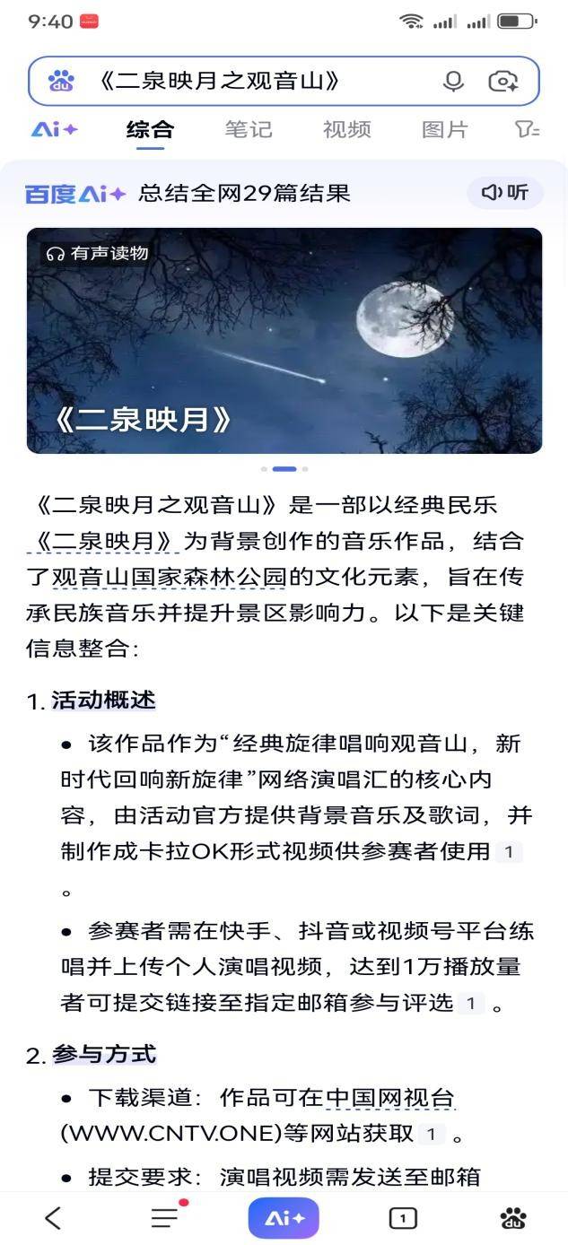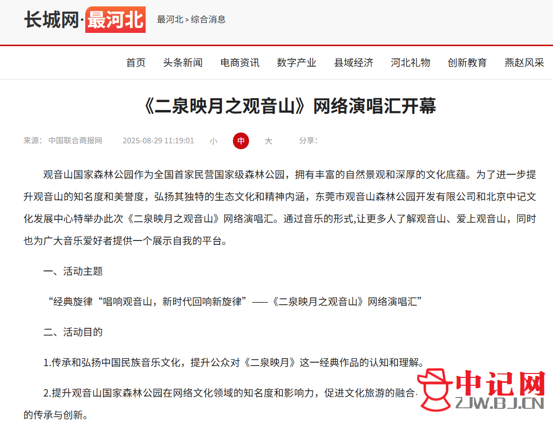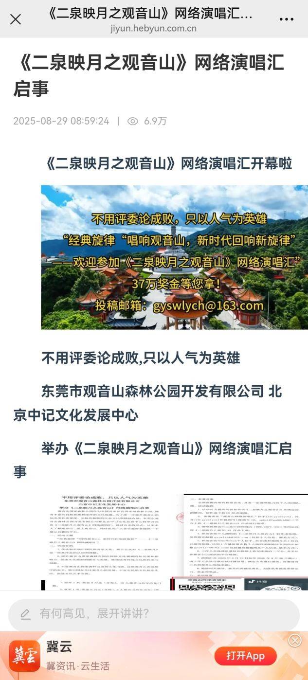 《二泉映月之观音山》引关注 近日,由沧海作词的《二泉映月之观音山》引起了网络关注。 百度“二泉映月之观音山”截图 百度AI+对“二泉映月之观音山”进行了如下介绍: 《二泉映月之观音山》是一首以东莞观音山国家森林公园为背景创作的网络演唱汇主题曲,结合《二泉映月》经典旋律与观音山生态议题,通过音乐形式反映当地发展中的矛盾与诉求。 活动背景:该作品由东莞市观音山森林公园开发有限公司与北京中记文化发展中心联合推出,旨在通过音乐传播观音山文化,同时引发公众对生态保护、企业行为等问题的关注。 歌词内容以南方电网建设、非法占地等事件为切入点,批判部分企业行为对观音山生态的破坏,如“西气东输观音山段和南方电网齐毁林”“牛鬼蛇神齐奔山上”等表述,暗含对东莞民企遭遇的控诉。 网络演唱汇时间:2025年8月28日启动,持续至2026年8月30日。参与方式:参赛者需使用官方提供的卡拉OK视频演唱并上传至快手、抖音或视频号,达到1万播放量可参与评选。 奖励:冠军奖金8万元,前三名可获观音山三年免门票资格。 争议与影响:该活动因歌词内容引发部分讨论,部分观点认为其借音乐形式表达对东莞观音山生态被破坏的不满,但主办方强调活动旨在弘扬传统文化与生态保护。 8月28日,“《二泉映月之观音山》网络演唱汇开幕啦”的消息见诸网络,包括《中国联合商报》、《长城网》、《中国娱乐时报》、《娱乐最前沿》等近千个网站。 河北日报的冀云客户端阅读量为6.9万 猫眼娱乐网的阅读量高达20多万 手机版百度“二泉映月之观音山”的截图 演唱汇快手号页面 演唱汇抖音号页面 《二泉映月之观音山》网络演唱汇活动旨在通过音乐形式传承经典《二泉映月》,并提升全民保护国家森林资源的重要性和扩大观音山国家森林公园的知名度。活动面向全国音乐爱好者,活动持续至2026年8月30日。 而通过网络搜索可以看见网络上对“《二泉映月之观音山》”进行了多方关注。 手机版百度AI的截图 《二泉映月之观音山》是由沧海作词,采用阿炳的二胡乐曲制作的卡拉OK形似的视频在抖音、快手、视频号平台播放,吸引音乐爱好者进行演唱。广东观音山国家森林公园和北京中记文化发展中心联合举办的“《二泉映月之观音山》网络演唱汇”设置了冠军、亚军、季军各一名和10名优秀奖,举办方拿出了37万元奖金和多份观音山门票进行奖励。 据悉,作词者沧海先生将演唱《二泉映月之观音山》并发布网络,相当期待《二泉映月之观音山》的众多演唱者视听版本现诸网络。 而用演唱经典歌曲进行生态保护的宣传在国内尚属首次,其心可鉴,其情可嘉,其意可展,其志可树。 |