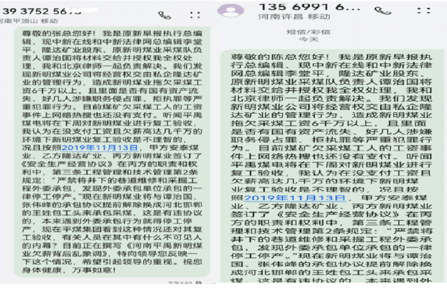 看看这个第十条规定:乙方和丙方未按时足额支付综合服务费、职工薪酬保障金、职工安置费,应急处置风险抵押金等费用,或单位职工工资超过1个月还不及时发放的,停产整顿至足额缴纳上述费用和支付欠发工资后,方可复工复产。因乙方股东内部发生纠纷,影响丙方正常安全生产经营活动的,对丙方方实施停产整頓,整顿时间至纠纷完全解决后,方可复工复产。 而谭治国就是乙方隆达矿业的股东,目前因为采煤队的资金结算股东内部发生纠纷,还没有解决。 多人发短信 阻止不了对平禹新明煤业的验收 26日,在得知平煤集团准备对平禹新明煤业的复工复产进行验收。于是撰稿人给平煤集团负责小煤矿管理的张浩先生和平禹煤电公司程洪涛总经理发送了以下短信。但没有得到任何回应。