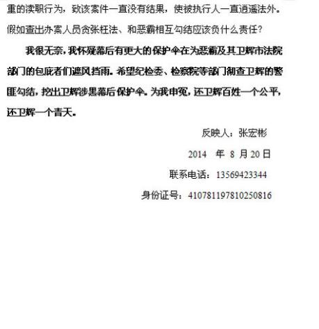 卫辉法院被曝问题多 其实在网上搜索卫辉法院负面信息一大片。 2010年1月21日110法律咨询网有帖子《卫辉法院法官违法行使职权给受害人造成巨大损失情况反映》,卫辉法院卫辉市人民法院 审判长:张闻华 审判员:李新根因违背法定程序、违法行使职权、枉法裁判导致受害人丧失了诉权、无法向实际肇事人追偿受害人已经支付过的12乘车人的医疗等费用。 ②要求卫辉法院因不履行法定职责、故意对应当采信的证据不予采信、故意违背事实和法律、滥用职权、枉法裁判造成受害人近10年为此交通事故案连续奔波而多支出的交通费、误工费、精神损失等费用。 百度贴吧的卫辉吧在2014年10月24日有一帖子《卫辉法院你执法为什么这么难???》反映的是卫辉市民吴玉清起诉倪保秀劳动报酬一案在2013年10月20号下判决书,2013年12月17号已申请的强制执行,至今已10个多月;期间他多次催促,仍毫无结果。百思不得其解,这究竟是为什么? 天涯论坛的天涯杂谈栏目2014年8月20日《河南卫辉法院执行民警充当流氓恶霸的保护伞》,该文同天在中国青年网河南频道发布。反映人张宏彬2011年一起民事案件被卫辉市人民法院依法判决后,两年多来,经我多次多方奔走相告,却没有得到一点实质性的进展。从法院判决到我申请强制执行,卫辉市法院王爱华受理该案件,我们多次要求强制执行,卫辉市法院王爱华一直要求我们提供流氓恶霸相关财产情况,作为一个小老百姓,了解流氓恶霸财产相当困难,然而每次我费尽周折提供给卫辉市王爱华相关流氓恶霸财产后,卫辉市王爱华警官总是以“没时间”、“需要核实”、“理由不足”敷衍搪塞我,不久后流氓恶霸马上就很神奇的针对我要求执行的财产进行转移,然后卫辉市王爱华警官就堂而皇之的告知我执行不了。 他反映了2点无奈:1、在法院判决书生效,我申请强制执行后,有关办案人员为什么不迅疾查封流氓恶霸及其父母在卫辉市李元屯镇牌杨庄新濮路边8间门面房、耕地,并冻结相关账户等,还徇私枉法,通风报信,包庇纵容!出具假证明,知法犯法!我很无奈,我怀疑卫辉市有司法机关的领导在为他们开脱讲情,甚至干涉了检察机关办案,现在卫辉市检查机关办案也有了阻力,按照现在各方给我的答复,我的案件永远不可能有结果,流氓恶霸永远不会得到惩治,卫辉隐藏在背后的黑社会势力的保护伞永远会逍遥法外,将会有很多象我一样的无辜可怜的弱势百姓任他们欺凌。 2、从强制执行起,我多次请求卫辉市法院王爱华执行流氓恶霸公开及藏匿资产,卫辉市法院王爱华均要求我提供详细的材料才可以往下办理,这我也认了,也许卫辉市王爱华工作忙,需要我去取证。每次我只能东西奔波提供信息,甚至悄悄带卫辉市法院王爱华指证流氓恶霸的资产,但每次提供能执行的有价值的信息不久,在没有强制执行前,流氓恶霸均能马上针对我提供的信息采取有效的措施进行财产恶意转移,致使法律执行不了,究竟是哪位特别知情人在为流氓恶霸通风报信?案件到了今天的地步,我多次要求由公安机关立案查处,彻查恶霸及谁是恶霸的保护伞,我咨询了,我的要求不过分,但为什么卫辉市人民法院一直不进行移交? 2014年05月15日天涯论坛 > 法治论坛有人发出《卫辉市人民法院无法无天》 :反映人李顺利称因1987年我和王征俊等人合伙承包卫辉市桥北电影院,后王征俊退伙,退伙时,我退给王征俊12883元,并由王征俊出具了收到条,但是不久后王征俊就买通了证人杨子江,并到卫辉市法院起诉我,称我还欠他2983元,他亲家市法院的,一审,二审我就输了,我当时不服就到新乡市中级人民法院审请在审,在审法院调查了杨子江,证人杨子江承认在一审,二审时做了伪证,并作出了悔过书,在审时新乡中院根据杨子江和其他证据,最终做出了驳回王征俊的起诉的判决,该判决现仍然有效。在终审判决做出后,我申诉前,王征俊就申请了强制执行,按法律规定可以,但是赫永贵身为执行庭庭长却置法律不顾,肆意的践踏法律,在对我的执行中,严重侵犯我的合法权益。根据《民事诉讼法》规定有能力履行而不履行生效判决书的,经院领导同意可以拘留,但是我的电影机已经被扣,因此不应再拘留我,但是赫永贵却拘留我十五天,为了逃避院领导的监督,在拘留我时没有任何法律文书,也就是说他跟本没有经过院领导同意,就私下将我非法关押了十五天。另在我被关押的十五天内,赫永贵每天就把我从拘留所带到法院进行辱骂,殴打,甚至在法院大院内公然的将我五花大绑的捆起来,然后掺无人道的用木棍从臂中插入向上撬。然后再非法关押我的十五天和对我肉体折磨期间,他又将罪恶的双手伸向我的电影机,在没有告知我的情况下,没有评估拍卖等任何手续的情况下,将我一万二千元买的电影机以4000元的价格卖掉,从中那到5000元的好处。因其非法变卖后,我的官司胜后也无法执行回转,对我造成了巨大的经济损失。根据赫永贵的行为,我国《刑法>>第二百五十四条,第三百九十九条之规定,已构成犯罪,应依法追究其刑事责任,但是卫辉市法院某些院领导却一再包庇,还说随便告,就是告到联合国也不行,在这他们就是法律,再胡告找人弄死我。万般无奈,我现在已经打官司已经20多年了,到现在卫辉法院都没有说法,难道中国的法律在卫辉市真的不管用吗,他们可以肆意践踏法律么?天下真的没有公理了么? 这么多