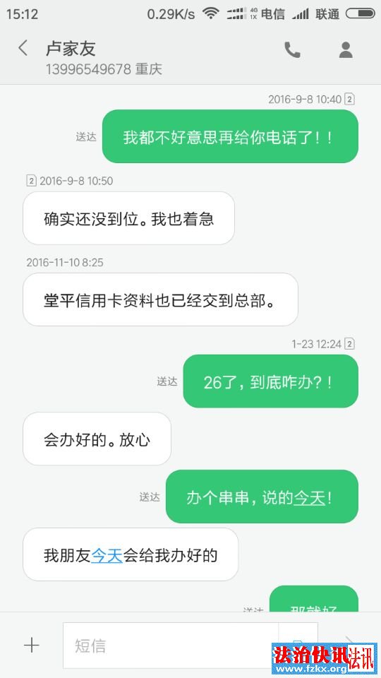 卢家友 在开县国税局办公室书写借条 但卢家友并没有按照约定付利息。2016年春节,在开县某饭店卢家友请了几个债主,席上表示4月底前全部还清。并将几个工程的相关资料给几个债主看,同时抱怨河南商丘的市政工程完工了却不予结算。本人当即表示可以出面协调。卢家友也高兴地答应。但之后一直没有任何行动。2016年5月上旬本人想在北京开店,即电话卢家友要求其还款,其表示想办法。又于7月电话其催款,表明儿子上学学费不够,其表示自己儿子上学也要几万元,将给予本人5千元救急。但直到9月,也没有见其还款!但是卢家友儿子上学了。 短信所说都没有兑现 2016年10月从北京回到开县的本人通过多渠道要账, 卢家友依然是多次答应能解决款项,但均没有兑现。也再也无法见面。2017年6月开始,本人表示儿子读研费用巨大,约定其在8月给予3万元,8月本人多次讨要,均表示几天内给但无踪影。再次约定的9月上旬搞定也泡汤。儿子读研的费用本人无奈亏了近10%卖股票才解决。 对该起借债情况,我有几点疑问: 一是卢家友在借钱时说其是通过其作为市政局长的老大获取,为何多年来还拿不到工程款,是否为欺诈性借款? 二是卢家友多次向本人说已经向承包公司负责人及渝北区某区长等人包了红包,能在近期内解决资金,但为何却多次无果?是否在诬陷别人来欺骗本人还是其他原因? 三是卢家友在2016年9月找本人微信得到其临江镇的房产证照片以办理高额信用卡以透支还本人借款,之后却一直没有回音,是否借此办理了房产证做其他用途? 四是在河南商丘的市政工程完工三年没有结账却一直不去处理,是否有这个工程还是在欺骗众债主? 五是从2016年春节后一直无法见到其本人,卢家友也多次关闭手机。是否在逃避什么? 对此,本人请卢家友本人给以正面回应解决多年来的借款问题。本人将在下月通过法律渠道讨回欠款,由此产生的一切损失(包括但不限于律师费用、从北京到开州区的一切开支等)理应由卢家友承担! (李堂平) |
