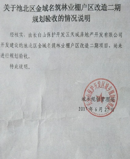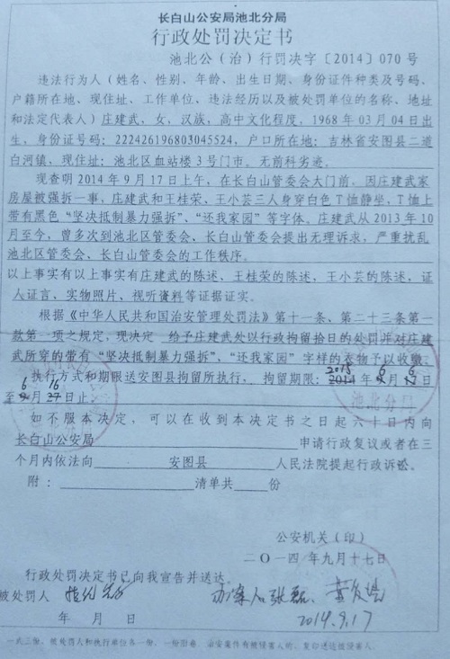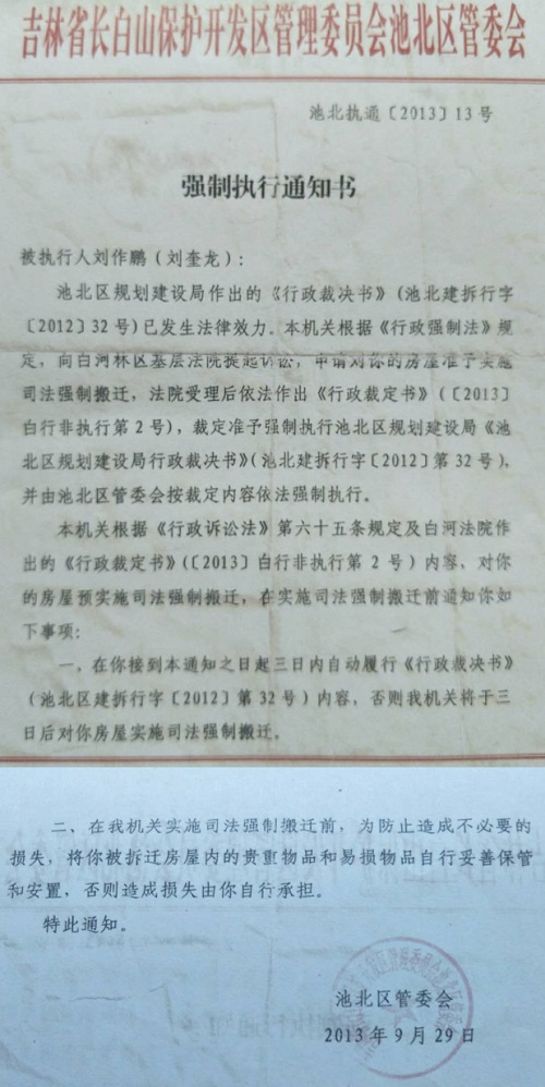 我刘作鹏及妻子庄建武居住的房屋位于吉林省安图县二道白河镇场区水塔胡同5号。2014年四月开发商放风说谈完姜玉宝家顺道把我们家强拆了,2014年4月19我们与其他几户一起到北京维权时,在家中无人的情况下4月21日被开发商领着综合执法的人强制偷拆了,后因拆迁补偿方案未达成协议导致至今无法回迁。  没能达成安置原因,是因为安置条件不公平所致。与其他回迁户的面积相当,却得到的安置补偿差距很大。为此庄建武曾在长白山管委会大门前穿戴有标语的上衣静坐,上衣正面书写“感谢习主席反腐倡廉,苍蝇老虎一起打”反面书写“长白山池北区欺压百姓,霸占财产,坚决反对官商勾结,维护公民合法权益”。庄建武这样做是想让政府为他做主,能够得到与其他回迁户同等的安置补偿。为此庄建武受到了池北分局的行政处罚。 标语为何写“长白山池北区欺压百姓,霸占财产,坚决反对官商勾结”?因为我的邻居薛某曾说过,两个门面卖给崔副区长(原副区长崔冒春曾被查现已刑满释放)一个,11000元一平米,庄建武说,那你不是吃亏了吗?薛某夫妻表示认了。  我们因为当时门面房价格在14800元一平米左右,卖给崔副区长11000元一平米,很明显的吃亏了,为何还要卖?此事,庄建武曾向王鹏飞书记说了好几次。之后崔副区长就没有再提及买房子的事了。我们夫妻去池北区政府见到崔副区长,崔副区长表示让他们与邻居姜家比较。我们家与姜家是东西院面积也差不多,后来就找到了主管拆迁的副区长邹承志把这事儿说了,邹副区长表示有可比较性。之后我们就找到了王鹏飞书记,把这事儿跟他说了,王书记就让开发商把姜家的合同送来,看完合同后,王鹏飞书记当着我们的面,给开发商李树枫打电话,问他正街还有门面吗?李树枫说有一个125平米的,王鹏飞书记又问还有没有了,李树枫说还有一个70多平米的,后来王鹏飞书记跟开发商说留着。这两个门面一直留到王鹏飞到管委会当副主任后才卖掉,因为我们一直看着这两个门面,得知被卖掉后非常生气,因为房子被拆迁前后都是王鹏飞说负责管我们家的,并且一管到底。为何王鹏飞刚刚调走,房子就被卖掉了呢。 其实真正的开发商是池北区综合执法大队长李品杰。当时李品杰的哥哥,弟弟、妹妹和他的姐夫老尤都参与了开发回迁安置补偿的谈判。尤其是李品杰的哥哥李品清表现最为猖狂。后来因为我们小区的业主反应特别强烈,前后到省里和北京状告李品杰,因此李品杰才把开发交给了他的远房亲戚李树枫。 因为这事儿当时在我们当地轰动挺大的,大家都知道,我们小区是池北区个别领导参与的。其实就是想空手套,打着棚户区改造的名义,套取国家补贴。特别是原管委会信访主任陈国栋,在被查期间,小区的财务账目上专门标有给陈国栋50万,陈国栋也曾经参与了安置补偿的工作,现已刑满释放了。 2017年6月22日9:00,在长白山保护开发区管理委员会,由吉林省政府组织举行的行政复议听证会,本次听证会听证员:张朝会、朱喜来两位省领导参加,据两位领导介绍是来自省法制办的,共同与开发商和我分别谈安置补偿问题,还表示说我要房子没有问题,还表示说地有多大,就可以要多大的房子。但是为何在开庭见面时却说,赶紧给多少要多少吧,别在开发商跑了。前后所说的差距很大,不知道中间发生过什么问题。  关于池北区金域名筑林业棚户区改造二期规划验收的情况说明,尚未进行规划验收。长白山管委会住房和城乡建设局给出了安置补偿申请答复是,把房子给公证提存了,但并没有看到公证提存的相关文件。如果没有完成验收的小区,可以入住吗?  在小区开发安置回迁补偿的问题上,也曾有多人多次因上访被刑事拘留,也有因上级领导来视察工作,怕上访人员闹事儿,也采取了拘留措施。