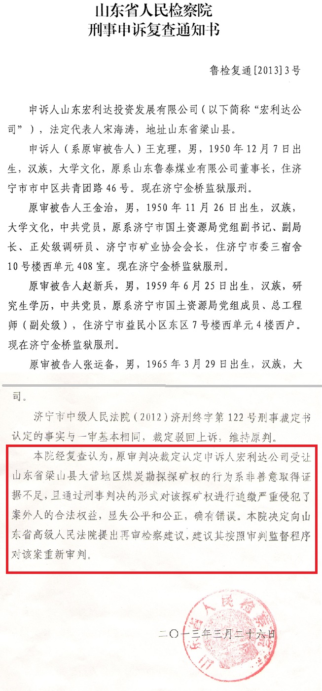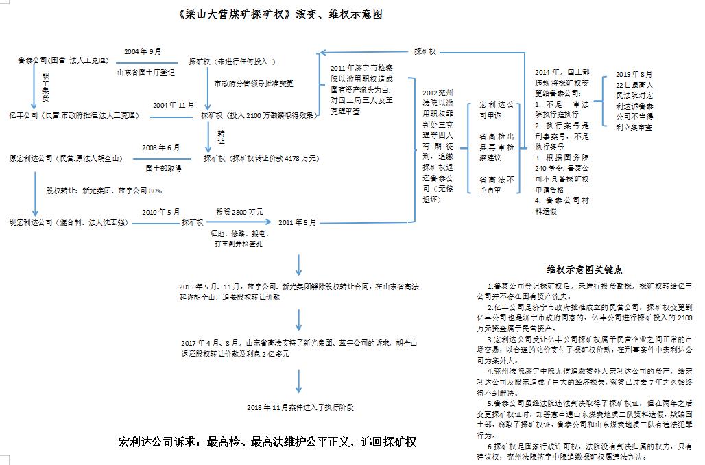 济宁市原市长梅永红干预1.6亿矿权案 致使民营企业破产倒闭 难以维权 撰稿人 胡全山  济宁市原市长梅永红,2011年任职期间,在腐败分子张延金(受贿,判刑15年)、曹旭东(受贿,判刑12年)的诬告纵容下,竟然目无党纪国法,将权力凌驾于法律之上,行政干预司法,迫使济宁市中级人民法院对民营企业山东宏利达投资发展有限公司横加迫害,致使宏利达公司经营停止、一企业主胡全山债台高筑2亿多元、两家民营企业濒临破产。 当今,从中央到省委都对民营企业的发展高度关注,宏利达公司及胡全山虽多方奔走呼号,时至今日,冤案仍未得到解决。梅永红的这一行为严重侵害了民营企业的合法权益,严重破坏了济宁市的营商环境,使很多外商对济宁市的投资环境望而却步。 案件背景及过程 民营企业依法取得探矿权 山东宏利达投资发展有限公司(以下简称:宏利达公司)为了受让《梁山大营煤矿探矿权》,于2008年6月设立立,民营企业,注册资本金4000万元,股东扈长全(曾用名:胡全山)占股95%、杨长勇占股5%,扈长全任法定代表人。 宏利达公司成立之后,依法以合理对价受让了济宁亿丰投资有限公司(以下简称;亿丰公司)的《梁山大营煤矿探矿权》(以下简称:大营探矿权),证号;T01120080901015698,支付了探矿权转让价款4178万元。  2010年5月,宏利达公司为了建设梁山大营煤矿,与新光集团有限公司(以下简称:新光集团)、淮北蓝宇洗精煤有限公司(以下简称:蓝宇公司)达成了合作协议,扈长全、杨长勇分别将75%、5%的股权转让给了新光集团、蓝宇公司,新光集团总经理宋海涛任法定代表人、董事长,扈长全及蓝宇公司法定代表人任宇等任董事。宏利达公司入驻矿区驻地,并于2010年6月、2011年3月先后增资3000万元、6000万元,注册资本金达到1.3亿元,开始征地、修路、架电、打井、打主副井检查孔,投资将近2800万元,采矿权申请同时也在进行中,山东省发改委已准备批准大营煤矿采矿权。 恶人告状,梅永红干预司法制造冤案 2011年6月,鲁泰煤业公司原总经理张延金、济宁市国资委原主任曹旭东到济宁市原市长梅永红那里告状,称大营探矿权原为鲁泰公司所有,系国有资产,两个多亿,大营探矿权变更为国有资产流失,梅永红被蒙蔽,不做调查研究,武断干预司法,指使济宁市检察院将济宁市国土资源局原副局长王金治、规划科科长张运备、总工程师赵新兵、鲁泰煤业公司原董事长王克理以滥用职权罪刑事拘留、并批准逮捕,将大营探矿权冻结。 案件背景:2004年9月14日,山东省国土资源厅根据鲁泰公司提出的申请,向该公司无偿颁发了“山东省梁山县大营地区煤炭普查”勘查许可证,探矿权证号:3700000410999,并载明勘查面积43.32平方公里。鲁泰公司取得探矿权后,并没有任何资金投入,也没形成资产 ,它仍然只是国家的行政许可。 鲁泰煤业公司是国家批准的债转股企业,其中:中国信达资产管理公司占54%,济宁矿业集团占46%。为加强产权制度改革,推进鲁泰公司股份制改造,股东双方研究后,济宁市政府于2004年8月26日召开会议,并下发了济政纪字[2004]54号《专题会议纪要》决定:由鲁泰公司干部职工出资成立济宁亿丰投资公司,分别接收信达公司和济矿集团分别退出16.54%、 16.46%的国有股权,退出后的股权比例调整为:信达公司占37%、济矿集团占30%、亿丰公司占33%,根据《专题会议纪要》精神, 鲁泰煤业有限公司干部职工共集资3350万元,以捆绑式的方式由28个自然人作为股东代表进入股东会,2004年10月济宁亿丰投资公司日正式设立,选举股东鲁泰公司董事长王克理同时兼任亿丰公司董事长,张延金未入股亿丰公司。后因鲁泰公司的股份制改造未能到位,与亿丰公司的关联关系随之终结。 2004年11月,为了更好的开发利用好济宁的煤炭资源,经分管工业的副市长魏玉栋、副秘书长孔宝琪同意,市国土资源局审查后报请省国土资源厅批准,将大营探矿权变由鲁泰公司更到亿丰公司名下,勘查证号370000421320,面积仍为43.32平方公里。因大营探矿权变更前鲁泰公司尚未投资勘探,所以大营探矿权变更仍然是行政许可和勘查权力的变更,并非资产变更,根本没有国有资产流失。  原市政府副秘书长孔宝琪说明 2004年12月,亿丰公司取得了大营煤矿探矿权后,即开始了煤炭勘查工作,与江苏煤炭地质勘察二队签订了“山东省梁山县大营井田勘察施工协议”,与江苏煤炭地质物测队先后五次签订“梁山县大营煤田勘探区”地震勘探工程施工合同, 在两年多的是时间里亿丰公司共投入勘探资金2100万元。 2006年6月,江苏煤炭地质勘察二队和江苏煤炭物测队形成了“山东省梁山煤田大营井田勘探报告”,2006年9月25日,山东省国土资源厅评审了“勘探报告”,出具了鲁资能备字【2006】33号《山东省梁山煤田大营井田勘探报告》矿产资源储量评审备案证明。自此大营煤炭探矿权才具有了商业价值。民营企业投资取得的成果,为私有财产,不属于国有资产。 2007年7月25日,亿丰公司增加了勘查面积,到国土资源部换发了新的矿产资源勘查许可证,证号0100000720556,勘查面积54.72平方公里。 2007年底,国家纪委、煤矿安全总局发布了煤炭企业领导干部不准投资入股煤矿问题的通知,根据通知精神,亿丰公司于2007年4月18日召开股东会议,会议通过了《关于王克理等五人退出公司股权的议案》,退出的股份由市国有承接;股权退出后,亿丰公司的股东由原28名调整为22