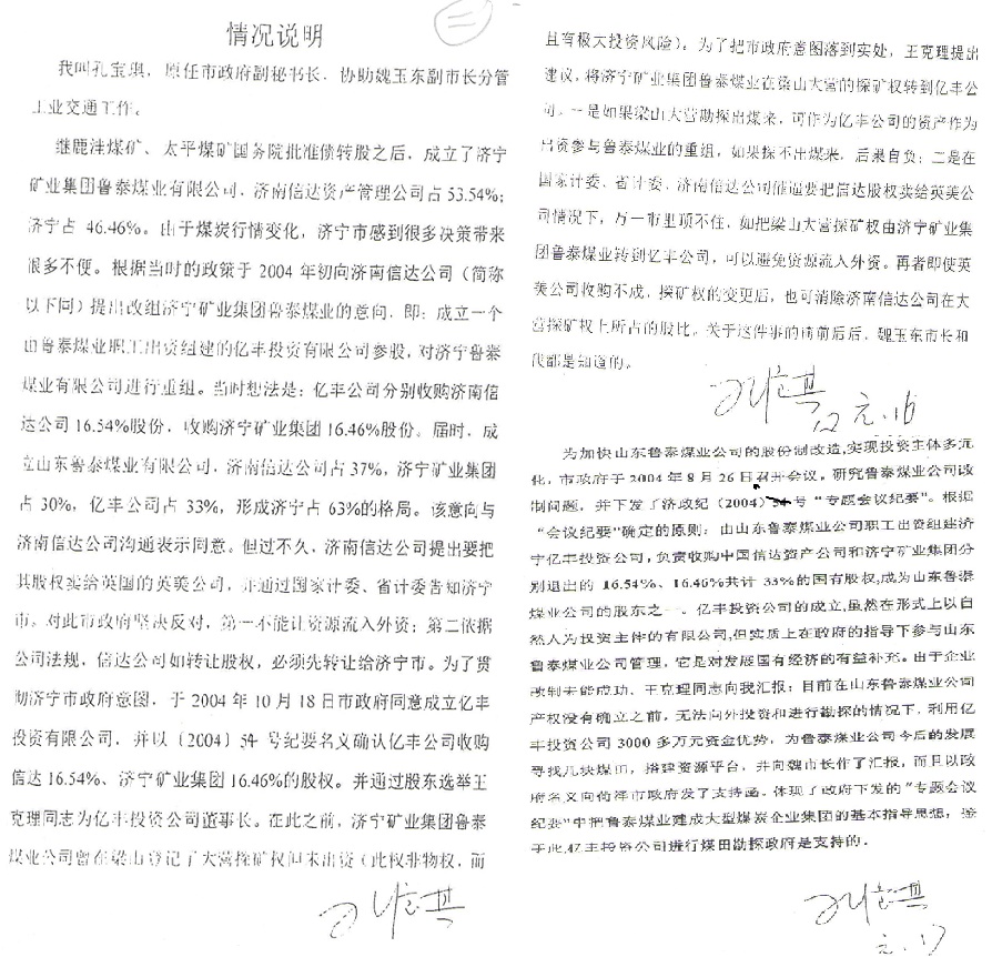 2008年5月8日,济宁市纪委、国资委等五部门联合下发济纪字(2008)12号《关于对煤炭企业投资入股问题进行清理纠正的通知》,亿丰公司股东属于鲁泰公司的干部职工,属清退范围,根据上述情况为完成市纪委撤资退股任务,尽快偿还职工集资,亿丰公司于2008年5月14日召开股东大会决定:公司撤资退股、清算注销,并对探矿权对外有偿转让及价格等有关问题作出决议。会议同时决定:1、王克理作为股东会的代表,全权负责公司解散清算、探矿权有偿转让事宜,代表公司落实股东会的决议,处理公司事务;2、推举王克理、朱玉亮、楚旭峰三股东组成清算组,王克理任组长,依法行使清算职责;3、公司清算价款除按《公司法》的规定支付费用、税款、债务外,全部用于支付股东出资股本及利息,同时对探矿权转让价款的基本原则作出规定,会议结束后按照《公司法》、《公司章程》的规定依法成立清算组,聘请律师及会计师事务所全程跟踪服务,发布《清算公告》办理报备手续,提交《清算审计报告》,并经省国土资源厅审查报请国土资源部批准,大营探矿权对外实行了有效转让等项工作。 2009年元月17日亿丰公司召开股东大会通过了《财务清算报告》和剩余资产分配方案,圆满完成清退任务,退股率达100%。 2009年元月份,亿丰公司撤资退股刚刚完成,鲁泰公司总经理张延金不惜动用2000万元国有资金对亿丰公司的股民的股权进行再次清退(只退还股金),这种跨所有制清退股权是严重的违法犯罪行为,而这种行为却得到济宁市国资委主任曹旭东明目张胆的支持(上述两人均判刑入狱),随即派国资委副主任林晋前往鲁泰公司召开所属企业副职以上的领导干部会议宣布:亿丰公司退出的股权无效,谁要去领,是党员的开除党籍,是干部的撤职,是职工的开除,大有山雨欲来风满楼味道。 贼喊捉贼、欲盖弥彰,为掩盖造成上述国有资产流失的违法犯罪事实,平息事态,张延金、曹旭东通过编造虚假材料,于2009年1月22日向市中级法院提起民事诉讼:以亿丰公司撤资退股清算注销侵犯了鲁泰公司的利益为由,诉亿丰公司“清算无效”一案,这种行为最终被市中级法院裁定驳回。 一招不行又来一招,2009年5月,济宁市国资委主任曹旭东签发《呈阅件》,向市委书记报送撤资退股的情况,指出:“亿丰公司非法转让梁山大营探矿权----王克理等人股权至今没有退出---。”市委书记作了重要批示:“请丽华约周洪、庆建、升英、世杰(上述人员分别为市纪委书记、副市长、检察院院长、法院院长、公安局长)研究个办法和措施加以解决”在此情况下济宁市纪委约济宁市检察院、济宁市国资委纪委组成调查组对上述问题进行调查,认为并没有造成国有资产流失,也并非非法转让,调查宣告结束。 亿丰公司解散清算注销,首先要考虑三个方面的问题,债权、债务、股东的股本及利息。2004年10月亿丰公司成立时,鲁泰煤业公司职工作为股东募集资金3350万元,2004年至2006年用于煤田勘探2100万元,还有其他一部分债权债务,亿丰公司没有其他资产,只有探矿权有偿转让,才能解决上述问题。 亿丰公司首先考虑到大营探矿权在梁山县境内,为加快开发建设,将探矿权转让给梁山县政府较为合适,并向县政府作了汇报,因没有合适的公司,政府想出资2000万元把探矿权买下来,后续再作打算,因为价钱太低,不足以解决亿丰公司的清算问题,政府收购探矿权没有谈成。 亿丰公司继续寻找新的买家,先后与山东丰富物质贸易有限公司、北京沃美科贸有限公司进行了洽谈,最后与北京沃美科贸有限公司达成了协议,北京沃美科贸有限公司以3880万元的总价收购亿丰公司大营煤炭探矿权。2008年6月中旬,北京沃美科贸有限公司以大营煤矿储量低、煤层薄、投入大、产出小、效益低、回报慢撤销了合同。 2008年6月下旬,亿丰公司与山东宏利达投资发展有限公司达成了协议,以北京沃美科贸有限公司同样的价格(3880万元)转让探矿权,6月29日双方签订了探矿权转让合同,10月22日又签订了补充协议,山东宏利达投资发展有限公司支付了相应的价款,后期因亿丰公司在清算过程中有部分债务未处理完,宏利达公司又给亿丰公司增加了298万元价款,最终宏利达公司以4178万元的总价款取得了“梁山大营煤矿探矿权”。 根据亿丰与宏利达公司签订的探矿权转让合同,支付了合理对价后,按照法定程序及要求双方开始办理转让手续,并报山东省国土资源厅审查, 2008年10月19日,山东省国土资源厅向国土资源部开发司出具了鲁勘登字【2008】18号文,证明《山东省梁山大营地区煤田普查》项目,其探矿权人为济宁亿丰投资有限公司,勘查许可证号为:T01120080901015698,首次设立时间为2004年9月14日,该项目勘察范围内无国家出资勘查并已探明的矿产地,无探矿权灭失的矿产地。领取勘察许可证后,勘查投入中无中央财政和省财政资金的审查意见。 2008年12月8日,国土资源部开发司根据宏利达公司的申请、探矿权转让合同、有关地质资料、山东省国土资源厅的证明、国家法律、法规规定,经严格审查合格,将梁山大营探矿权由亿丰公司变更到宏利达公司 证号:T01120080901015698。 2012年4月24日,按照梅永红的旨意,兖州市人民法院刑事判决书非法判决:以滥用职权罪、受贿罪判处王金治、张运备、赵新兵、王克理有期徒刑,由于四人滥用职权犯罪行为造成流失的证号为:T01120080901015698矿产资