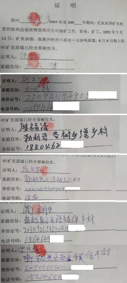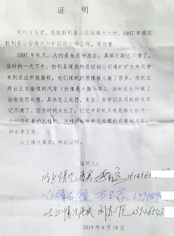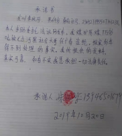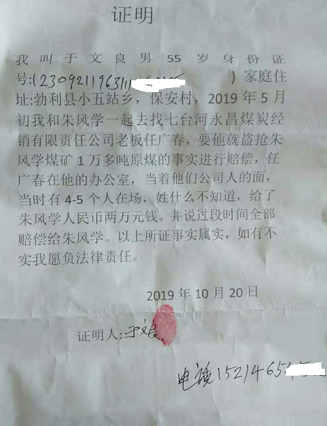 七台河黑社会任广春再遭举报:20多年前抢劫1万多吨原煤至今没处理 我是举报人朱凤学,农民,现年64岁。现住址:七台河市勃利县小五站镇大六村。就任广春(现任七台河市永昌煤炭有限责任公司经理)强抢我的财产一案及背后存在保护伞问题进行举报。 1996年,我承包了七台河市勃利县煤炭物资经销公司大六林场南山的一个煤矿,以及勃利县大六林场白家沟连发煤矿。1997年7月,我在大六林场南山煤矿生产了1万多吨原煤(有矿工证实),准备出售,收取购买方订金50万元。期间,我和员工去白家沟连发煤矿整改矿区,大六林场南山煤矿只留一名更夫李德喜看煤。8月8日返回南山煤矿时,几台汽车和装载机正在装煤,我截住了两名翻斗车司机并送到大六矿区派出所,派出所长李玉宾和民警刘志厚,协警方玉君参与该案处理(有三人证言)。据司机供述,抢劫我原煤的嫌疑人是黑社会头子任广春。派出所只对任广春进行了治安处罚,任广春没有赔偿我1万多吨原煤。我无煤可付,导致需要双倍赔偿订金,同时没有资金为工人开工资,无法维持生产。县煤炭公司解除了我和大六煤矿的承包合同。为偿还工资和赔偿订金,我几年后将白家沟连发煤矿承包经营权出售。中央开展扫黑除恶斗争以后,今年5月,我去任广春的公司要钱,任广春还了我两万块钱,说过几天再给。两个月后,我去找他要钱,他威胁说,钱都给派出所了,再来要钱打死你全家。为安全起见,我把儿子送回山东老家。 由于公安机关没有及时处理任广春抢劫我原煤的行为,导致我企业营产。背上几百万债务。我去七台河市及勃利县扫黑办,要求惩办任广春,但至今没有结果。法讯网联动记者纪奎权网上发表《黑龙江省七台河市涉黑大哥任广春及保护命何时处理?》报道后,竟有公安机关为其充当说客。希望中央督导组尽快督促有关部门对任广春抢劫案件认真审查,将其抓获归案,为民除害,挽回我的损失。 派出所接警人员证明 举报人:朱凤学身份证号: 23092119550710**** 联系电话: 13946501679 多名矿工证明 朱凤学的承诺书 相关报道: 法讯网发布《黑龙江省七台河市涉黑大哥任广春及其保护伞何时处理?》后 |