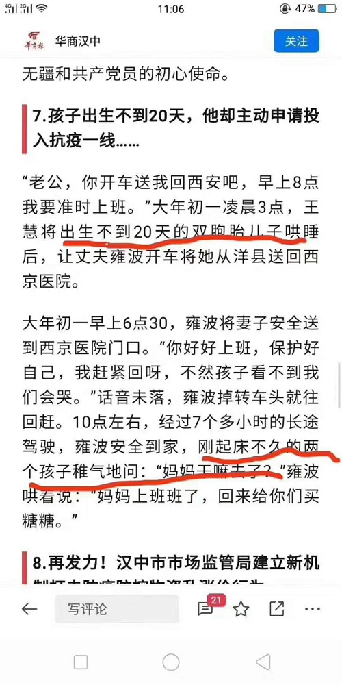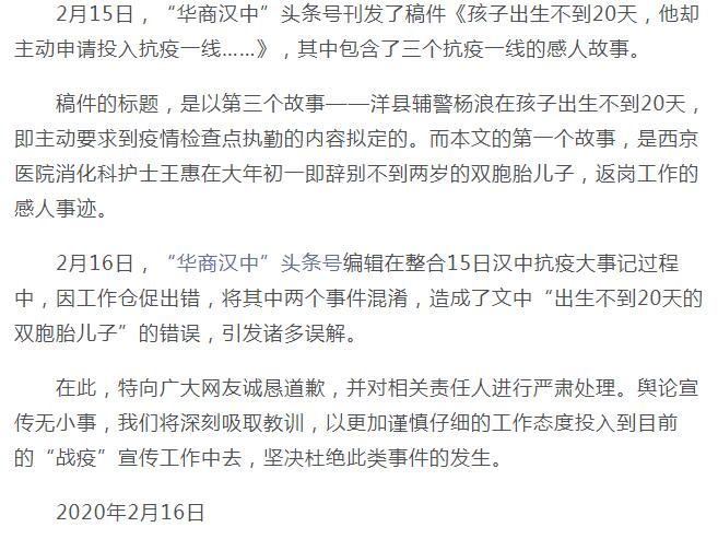 华商报,你们的新闻的节操在哪儿 独立撰稿人 李海波 2月15日,“华商汉中”头条号刊发了稿件《孩子出生不到20天,他却主动申请投入抗疫一线……》,其中包含了三个抗疫一线的感人故事。新闻是这样写的:“老公,你开车送我回西安吧,早上8点我要准时.上班。"大年初一凌晨3点,王慧将出生不到20天的双胞胎儿子哄睡后,让丈夫雍波开车将她从洋县送回西京医院。年初一早.上6点30,雍波将妻子安全送到西京医院门口。“你好好上班,保护好自己,我赶紧回呀,不然孩子看不到我们会哭。”话音未落,雍波掉转车头就往回赶。10点左右,经过7个多小时的长途驾驶,雍波安全到家,刚起床不久的两个孩子稚气地问:“妈妈王嘛去子2“雍波哄着说:“妈妈. 上班班了,回来给你们买糖糖。" 16日深夜,华商报致歉书给出的解释是:稿件的标题,是以第三个故事——洋县辅警杨浪在孩子出生不到20天,即主动要求到疫情检查点执勤的内容拟定的。而本文的第一个故事,是西京医院消化科护士王惠在大年初一即辞别不到两岁的双胞胎儿子,返岗工作的感人事迹。2月16日,“华商汉中”头条号编辑在整合15日汉中抗疫大事记过程中,因工作仓促出错,将其中两个事件混淆,造成了文中“出生不到20天的双胞胎儿子”的错误,引发诸多误解。 对此致歉,撰稿人还是不服:一是文章内容本来是洋县辅警杨浪在孩子出生不到20天即要求执勤,事实属实么?坐月子中就要求上岗,这真是不要命啊?二是致歉书里写的“2月15日,“华商汉中”头条号刊发了稿件《孩子出生不到20天,他却主动申请投入抗疫一线……》,其中包含了三个抗疫一线的感人故事。”也就是说文章是2月15日发布的,但这里又说“2月16日,“华商汉中”头条号编辑在整合15日汉中抗疫大事记过程中,因工作仓促出错,将其中两个事件混淆......”你们工作严谨点好不?三是《孩子出生不到20天,他却主动申请投入抗疫一线……》文章中包含了三个抗疫一线的感人故事,但是看看法的那文章《孩子出生不到20天,他却主动申请投入抗疫一线……》编号是7,下面还有“8.再发力,汉中市市场监管局......”华商报,一个谎话十个圆,圆谎掰下手指头算算再圆好不好?! 既然这么多感人事例,为何没有图片?有记者现场采访吗?!新闻的生命是真实!没有事实就没有新闻,事实是新闻的生命。新闻的特点就是真实性、及时性、准确性!一篇新闻出笼,需要记者采写,编辑,责任编辑、主编、值班总编审核这一系列留存才会发布,这么多人把关,却管不住这一篇笑掉大牙的烂文?! 华商报,你们的的社会责任感哪去了?! -------------------------------------------------------------------------------------------- 附华商报致歉书附后的2月15日,“华商汉中”头条号刊发稿件【原稿虽然删除,但网友截图显示有8,呵呵】 《孩子出生不到20天,他却主动申请投入抗疫一线……》原文 1)“女儿,家里有我们照顾,医院需要你” “老公,你开车送我回西安吧,早上8点我要准时上班。”大年初一凌晨3点,王惠将双胞胎儿子哄睡后,让丈夫雍波开车将她从洋县送回西京医院。 王惠和雍波都是洋县龙亭镇杜村人,王惠在西京医院消化科当护士,雍波在西安创业,父母在西安帮她们照顾不到2岁的双胞胎儿子。腊月二十九,雍波一家回到洋县老家过年,同时走访多年未见的亲戚朋友,正月初八给孩子过生日。 但计划赶不上变化,新冠肺炎疫情爆发。正在吃年夜饭的时候,王惠突然接到医院上班的通知,一切计划全部泡汤。 “女儿,家里有我和你爸还有雍波,医院需要你,你赶紧回,路上小心点。”婆婆的一番话成为王惠强大的精神支柱。 夫妻两行车3个多小时,行程230多公里,平时繁忙的西汉高速,竟然没有碰到一辆车。大年初一早上6点30,雍波将妻子安全送到西京医院门口。“你好好上班,保护好自己,我赶紧回呀,不然孩子看不到我们会哭。”话音未落,雍波掉转车头就往回赶。10点左右,雍波安全到家,刚起床不久的两个孩子稚气地问:“妈妈干嘛去了?”雍波哄着说:“妈妈上班班了,回来给你们买糖糖。” 2)“儿子,等爸爸打完病毒小怪兽就回来陪你玩” “过年别人家小孩的爸爸都回来了。爸爸,你什么时候回来啊?”大年初二下午5点,正在西汉高速洋县出口疫情检查点执勤的李铎接到2岁小儿子的电话,眼眶湿润了。 李铎是江南中队中队长,中队负责的检查点是洋县重要的交通枢纽,仅大年初二就有4000多辆来往车辆。“要扎紧这个‘铁闸栏’,严防疫情向洋县扩散,不获全胜,决不收兵!”李铎立下了军令状。 李铎老家在勉县,妻子在勉县陕钢集团上班,7岁的大儿子和2岁的小儿子都留在勉县让父母照顾,母亲有糖尿病,父亲心脏也不好。今年,李铎本打算回勉县和家人团团圆圆过个年,而突如其来的疫情打乱了他的美好愿望。 “儿子,等爸爸打完病毒小怪兽就回来陪你玩,在家听爷爷奶奶话,爸爸爱你。”2月12日,李铎抽空和儿子通了一会电话。挂掉电话后,他翻开检查点的记录本,上面写着:“截止2月12早上8点,共排查车辆21329辆,体温检测28408人,未发现疑似人员。” 3)孩子出生不到20天,他却主动申请投入抗疫一线 “队长,疫情防控任务艰巨,我申请明天回来上班。” “你的孩子出生还不到20天,家里的事你能安排好吗?” “请队长放心,没有大家哪有小家,我妻子和父母都很支持我的决定。”大年三十,洋县金水中队辅警杨浪听说队友在